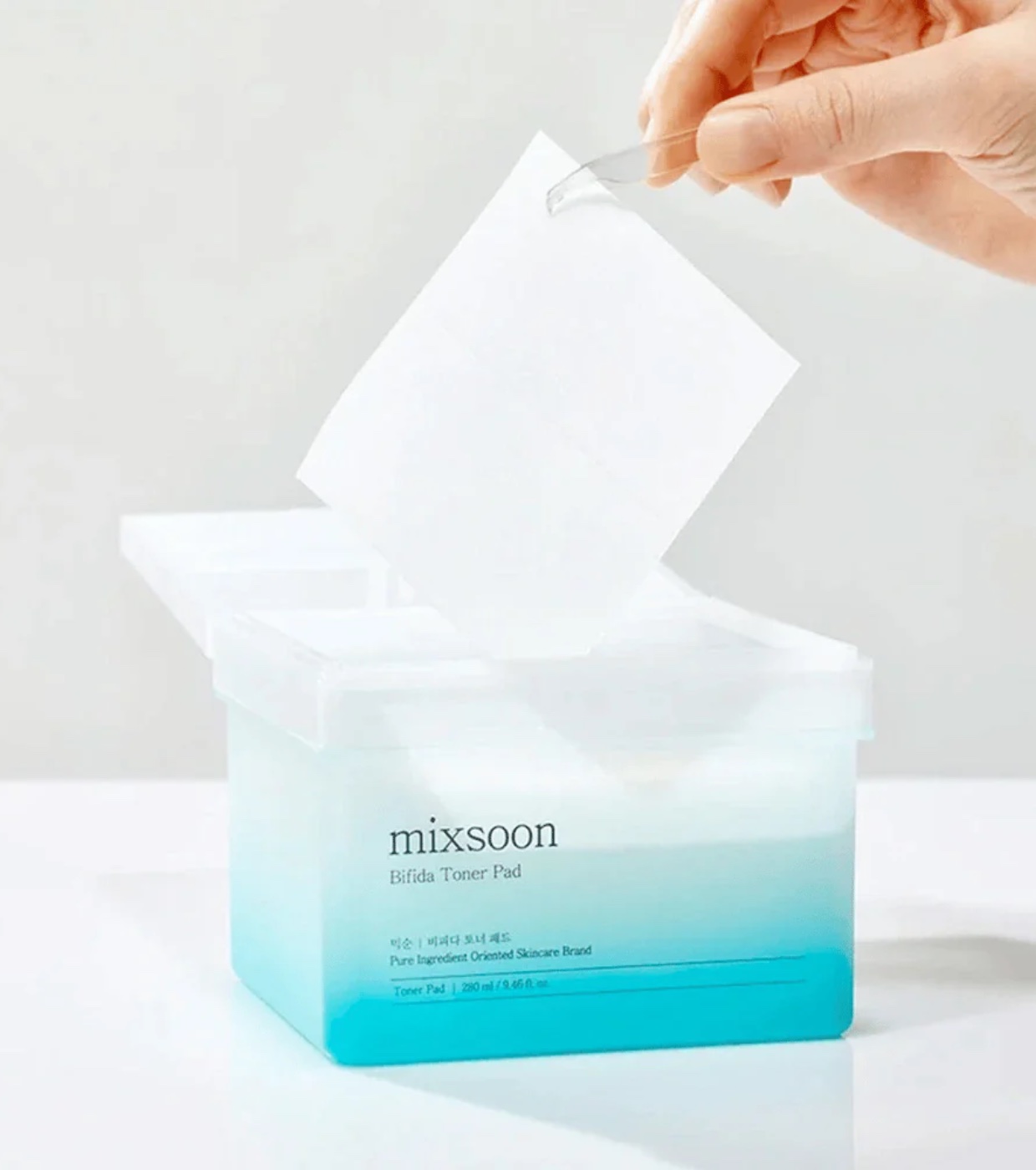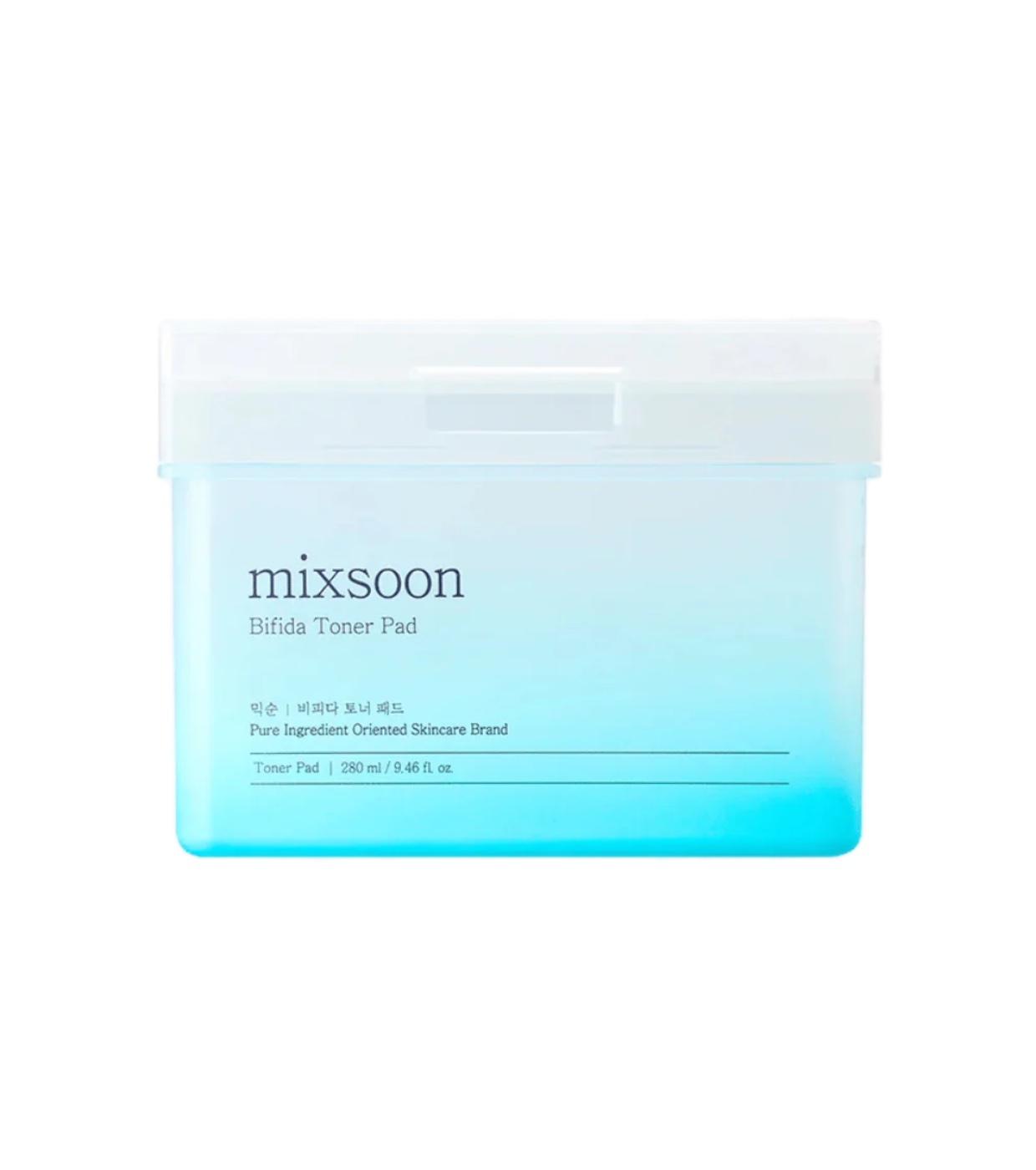 Mixsoon Os discos tônicos hidratantes Bifida são enriquecidos com lisado de fermento bífida, que ajuda a restaurar o equilíbrio natural de hidratação da pele e a reparar a barreira cutânea danificada.