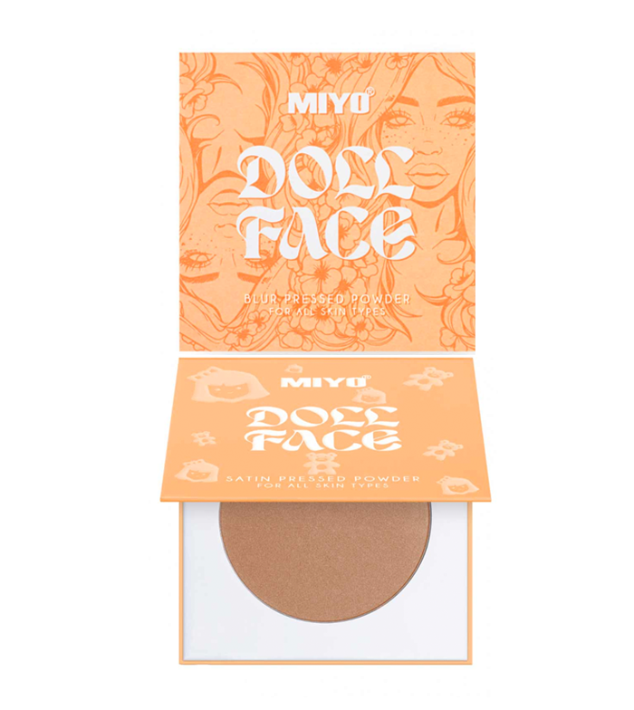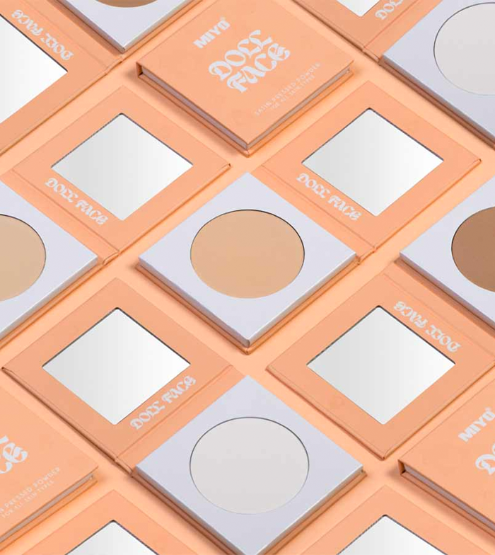 Nova fórmula aprimorada do pó para selar a maquiagem Doll Face da Miyo .