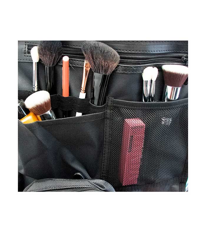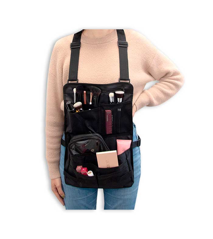 Este avental contém vários compartimentos de diferentes tamanhos para guardar todo o tipo de produtos de acordo com as suas necessidades: pincéis, pinças, maquilhagem, desmaquilhante, etc.