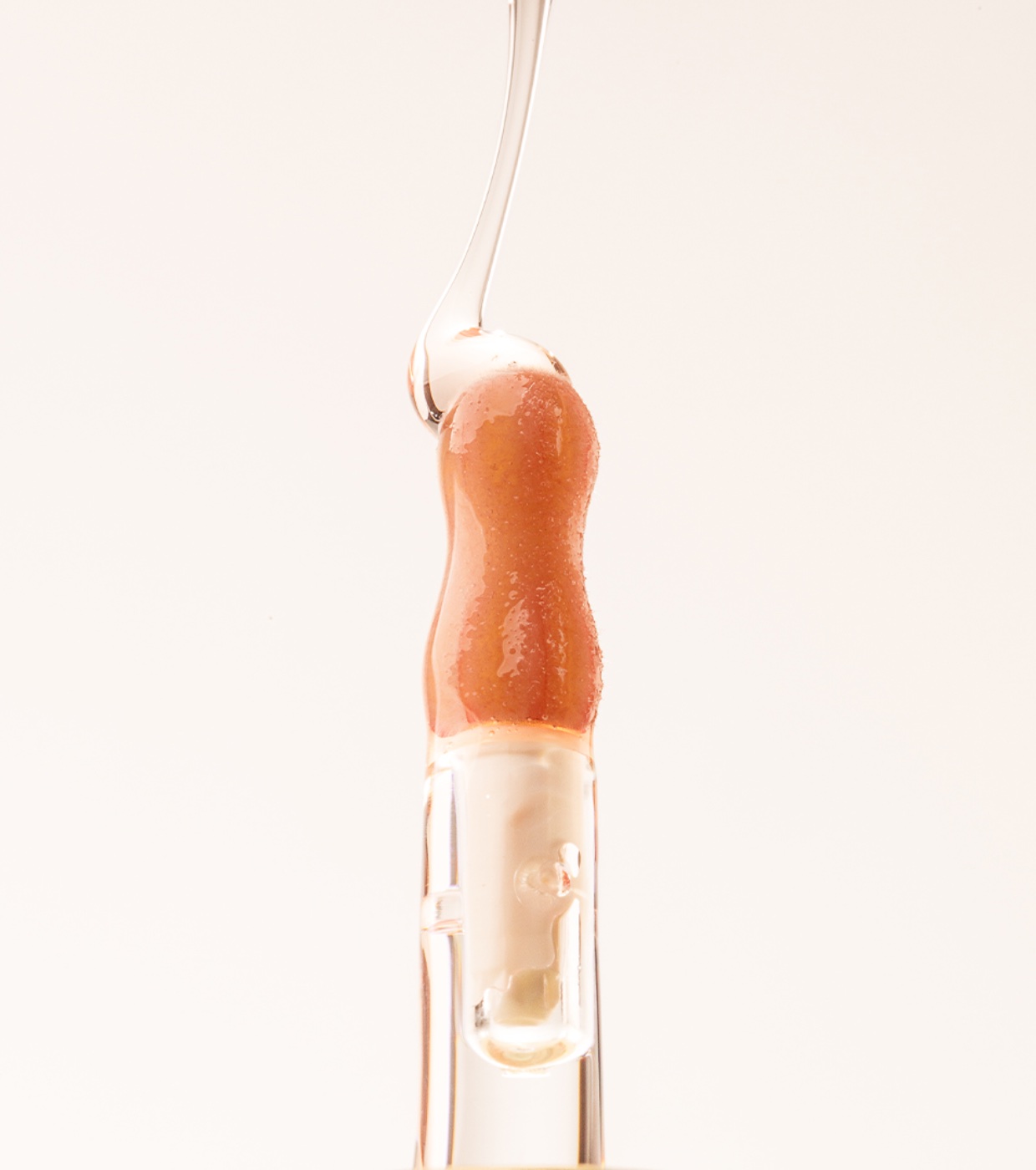 O aplicador em formato de ampulheta massageia enquanto libera óleo labial.