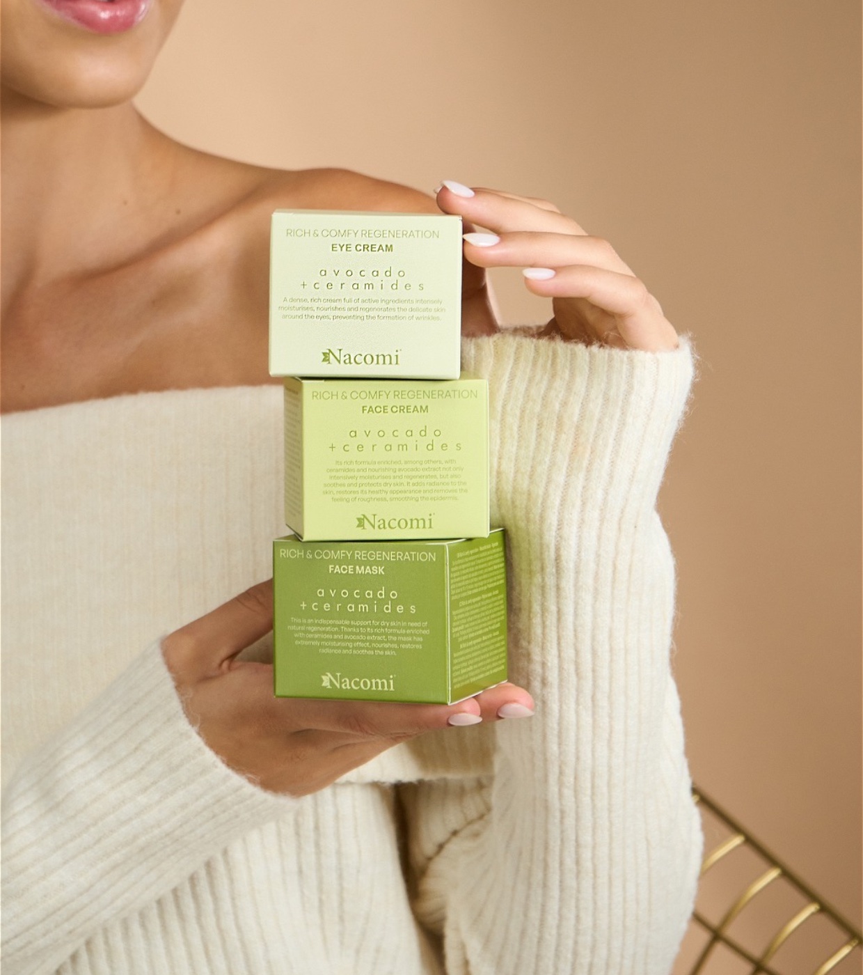 Rich & comfy regeneration - Krem do twarzy - Awokado/ Face cream - Avocado: Skladniki(INCI)/ Ingredients: Aqua, Persea Gratissima Oil, Coco-Caprylate/Caprate, Olea Europea Fruit Oil, Polyglyceryl-3 Distearate, Panthenol, Propanediol, Glycerin, Betaine, Trehalose, Cetearyl Alcohol, Sorbitol, Persea Gratissima Fruit Extract, Ceramide AP, Ceramide NP, Ceramide EOP, Hyaluronic Acid, Hydrolyzed Hyaluronic Acid, Sodium Hyaluronate, Sodium Hyaluronate Crosspolymer, Cholesterol, Phytosphingosine, Allantoin, Inulin, Cellulose, Fructose, Glucose, Maltodextrin, Hydrolyzed Glycosaminoglycans, Tocopheryl Acetate, Sodium Cetearyl Sulfate, Tetrasodium Glutamate Diacetate, Sodium Levulinate, Polyglyceryl-10 Stearate, Polyglyceryl-6 Behenate, Glyceryl Stearate Citrate, Xanthan Gum, Cellulose Gum, Biosaccharide Gum-1, Parfum, Triethyl Citrate, Benzyl Glycol, Behenic Acid, Citric Acid, Ethylhexylglycerin, Glyceryl Stearate, Sodium Benzoate, Sodium Sulfate, Sodium Hydroxide, Raspberry Ketone, Potassium Sorbate, Amyl Cinnamal, Cl 19140, CI 42090. Rich & comfy regeneration - Krem pod oczy - Awokado/ Eye cream - Avocado: Skladniki(INCI)/ Ingredients: Aqua, Persea Gratissima Oil, Propanediol, Coco-Caprylate/Caprate, Polyglyceryl-3 Distearate, Panthenol, Glycerin, Betaine, Cetearyl Alcohol, Trehalose, Phytosterols, Sorbitol, Ceramide NP, Ceramide AP, Ceramide EOP, Hyaluronic Acid, Hydrolyzed Hyaluronic Acid, Sodium Hyaluronate, Sodium Hyaluronate 15 ml Crosspolymer, Olea Europaea Fruit Oil, Cholesterol, Phytosphingosine, Inulin, Cellulose, Fructose, Glucose, Maltodextrin, Hydrolyzed Glycosaminoglycans, Tocopheryl Acetate, Tetrasodium Glutamate Diacetate, Polyglyceryl-10 Stearate, Polyglyceryl-6 Behenate, Ascorbyl Palmitate, Xanthan Gum, Cellulose Gum, Biosaccharide Gum-1, Parfum, Sorbitan Oleate, Citric Acid, Triethyl Citrate, Glyceryl Stearate Citrate, Glyceryl Stearate, Behenic Acid, Benzyl Glycol, Ethylhexylglycerin, Raspberry Ketone, Sodium Cetearyl Sulfate, Sodium Levulinate, Sodium. Benzoate, Sodium Sulfate, Sodium Hydroxide, Potassium Sorbate, Amyl Cinnamal, Cl 19140, CI 42090. Rich & comfy regeneration - Maseczka do twarzy - Awokado/ Face mask-Avocado: Skiadniki(INCI)/ Ingredients:Aqua, Persea Gratissima Oil, Cetearyl Alcohol, Glycerin, Trehalose, Coco-Caprylate/Caprate, Panthenol, Propanediol, Betaine, Sorbitol, Persea Gratissima Fruit Extract, Ceramide AP, Ceramide NP, Ceramide EOP, Hyaluronic Acid, Hydrolyzed Hyaluronic Acid, Sodium Hyaluronate, Sodium Hyaluronate Crosspolymer, Cholesterol, Phytosphingosine, Allantoin, Inulin, Cellulose, Fructose, Glucose, Maltodextrin, Hydrolyzed Glycosaminoglycans, Tocopheryl Acetate, Sodium Cetearyl Sulfate, Tetrasodium Glutamate Diacetate, Sodium Levulinate, Polyglyceryl-10 Stearate, Polyglyceryl-6 Behenate, Xanthan Gum, Cellulose Gum, Biosaccharide Gum-1, Parfum, Triethyl Citrate, Potassium Cetyl Phosphate, Benzyl Glycol, Behenic Acid, Citric Acid, Ethylhexylglycerin, Glyceryl Stearate, Sodium Benzoate, Sodium Sulfate, Sodium Hydroxide, Raspberry Ketone, Potassium Sorbate, Amyl Cinnamal, Cl 19140, CI 42090.