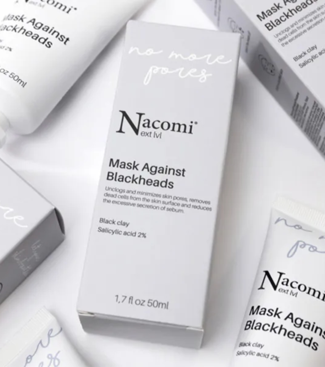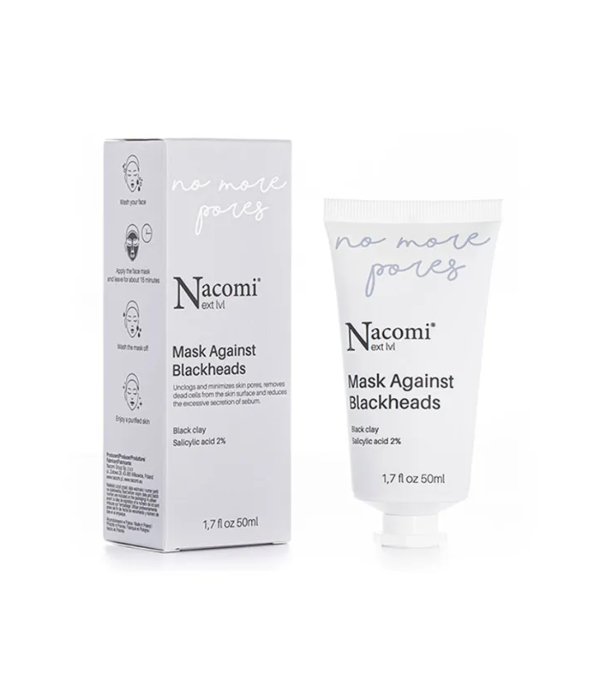 O ácido salicílico combinado com a argila preta desbloqueia e contrai os poros, remove as células mortas da superfície da pele e reduz a secreção excessiva de sebo, evitando assim a formação de espinhas.