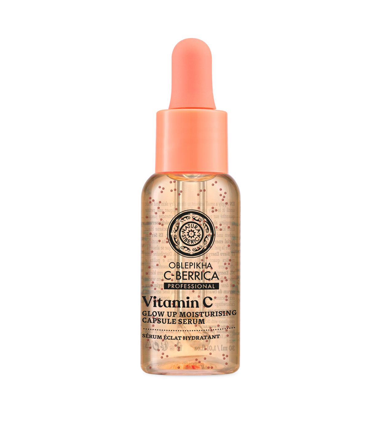 Transforme a sua pele e deslumbre com o Sérum Facial Hidratante de Vitamina C com Cápsulas Glow Up da linha Oblepikha C-Berrica da Natura Siberica .
