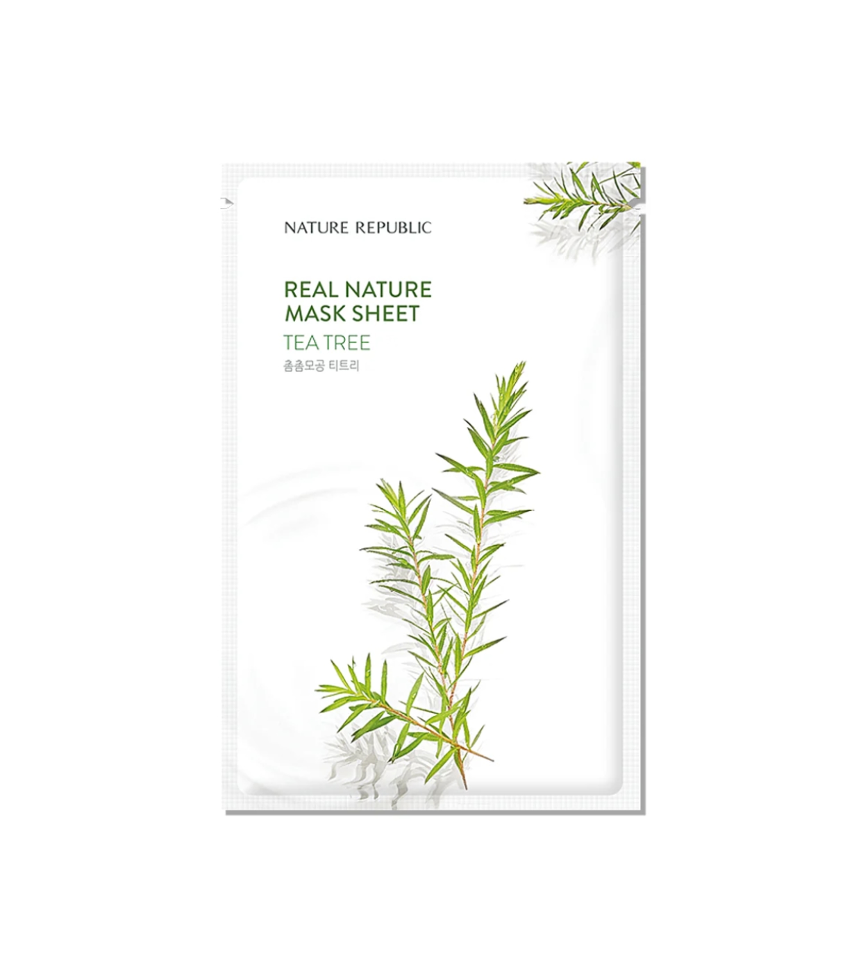A máscara facial Real Nature Tea Tree da Nature Republic possui ação purificante e calmante, ideal para peles com imperfeições ou propensas à acne.