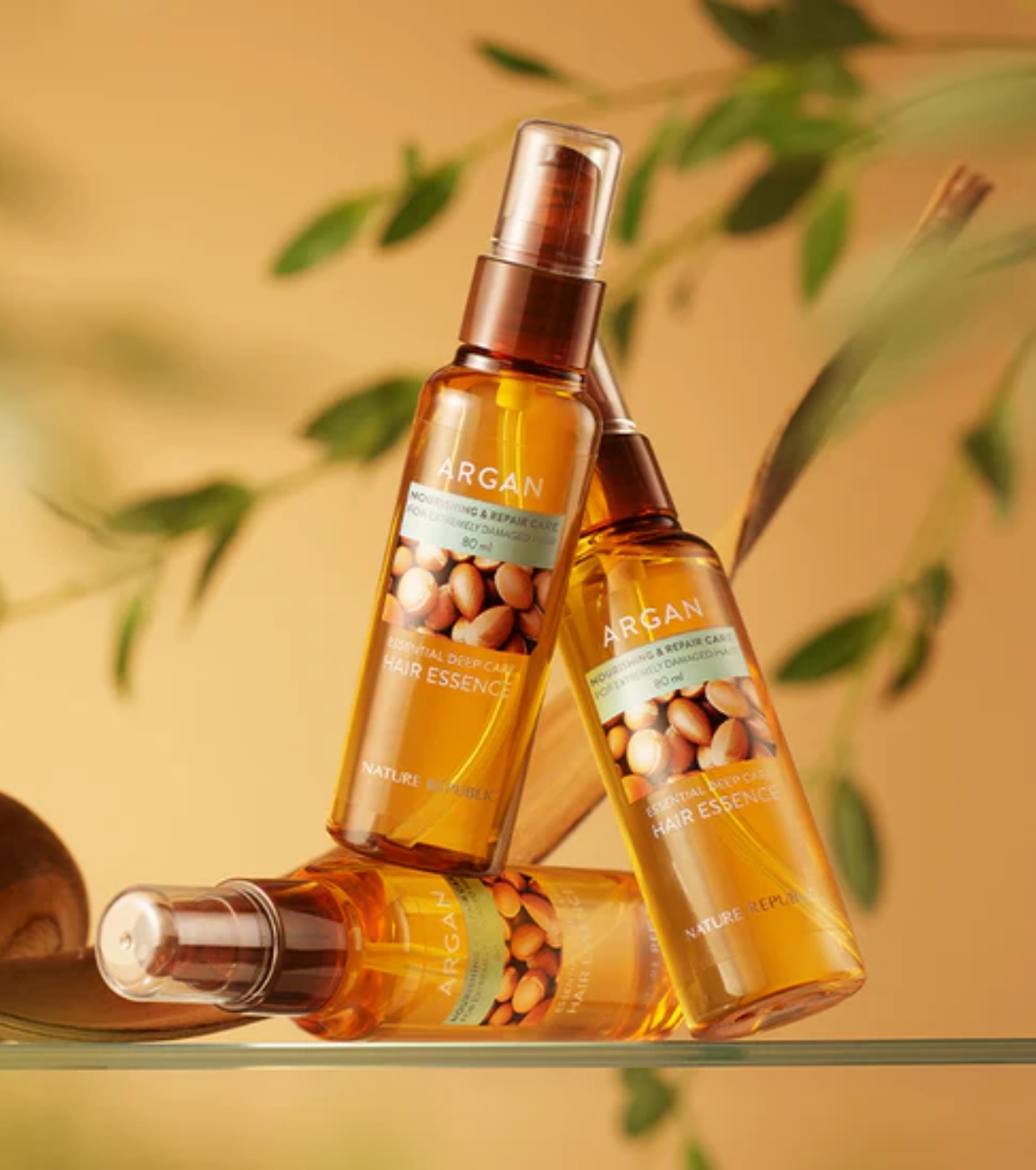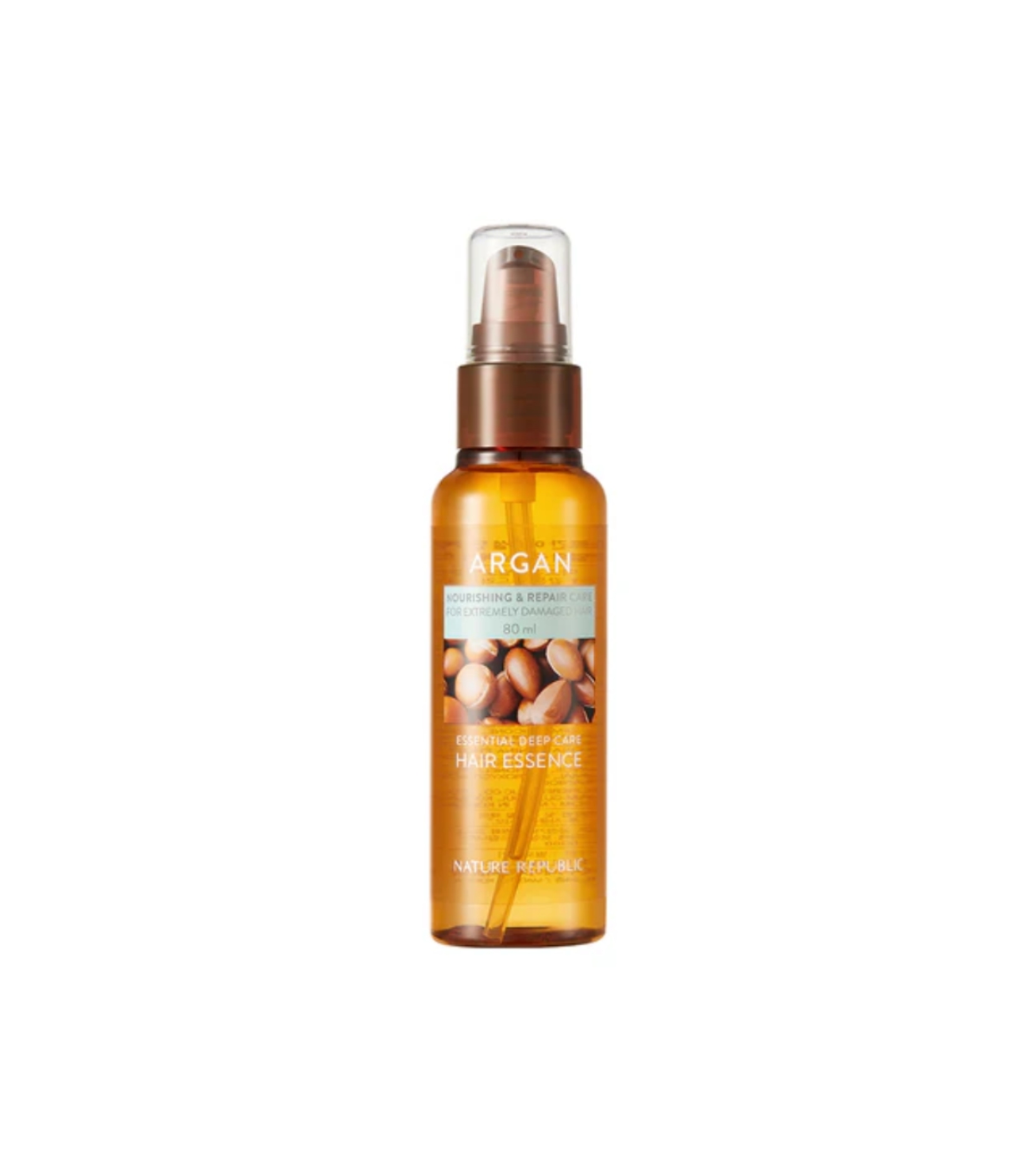 Devolva a vida, a maciez e o brilho aos seus cabelos com este óleo capilar leve e nutritivo Argan Essential da Nature Republic .