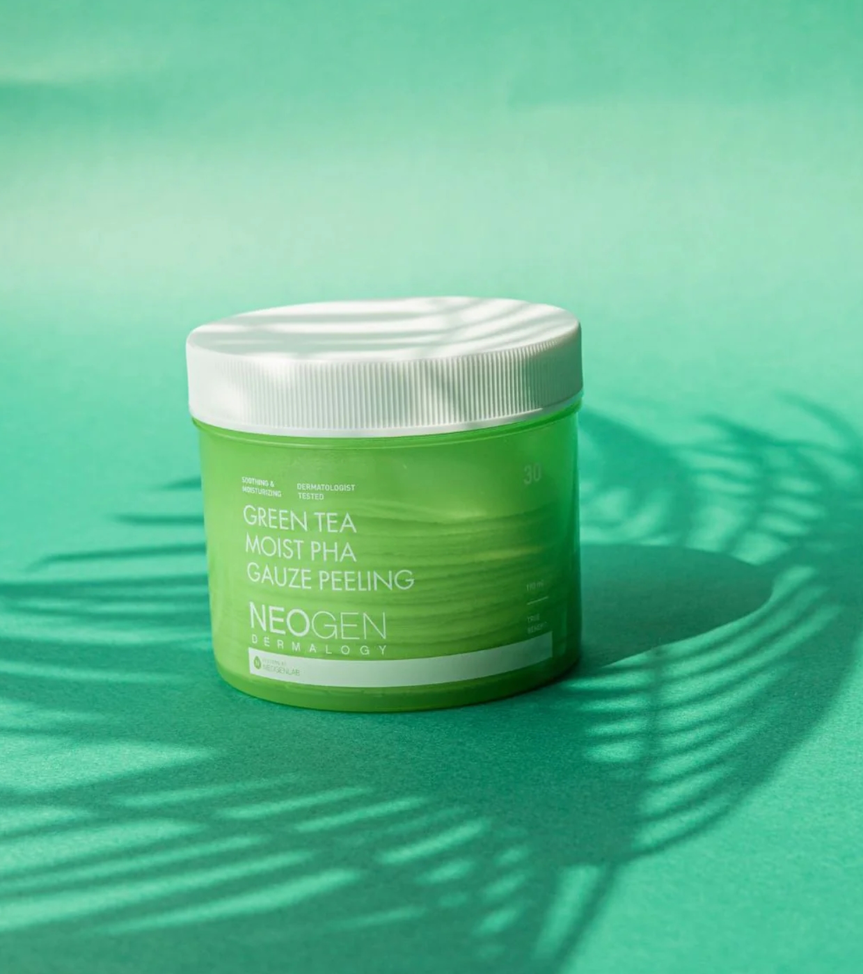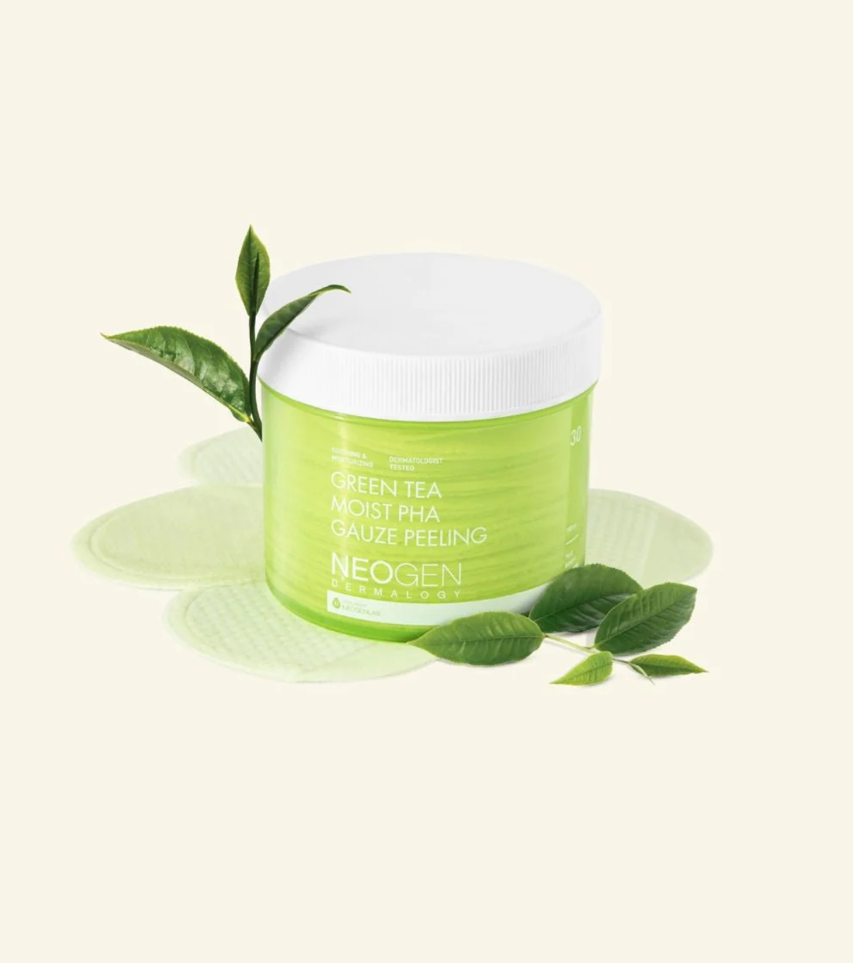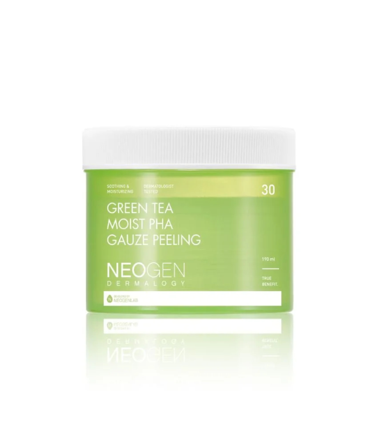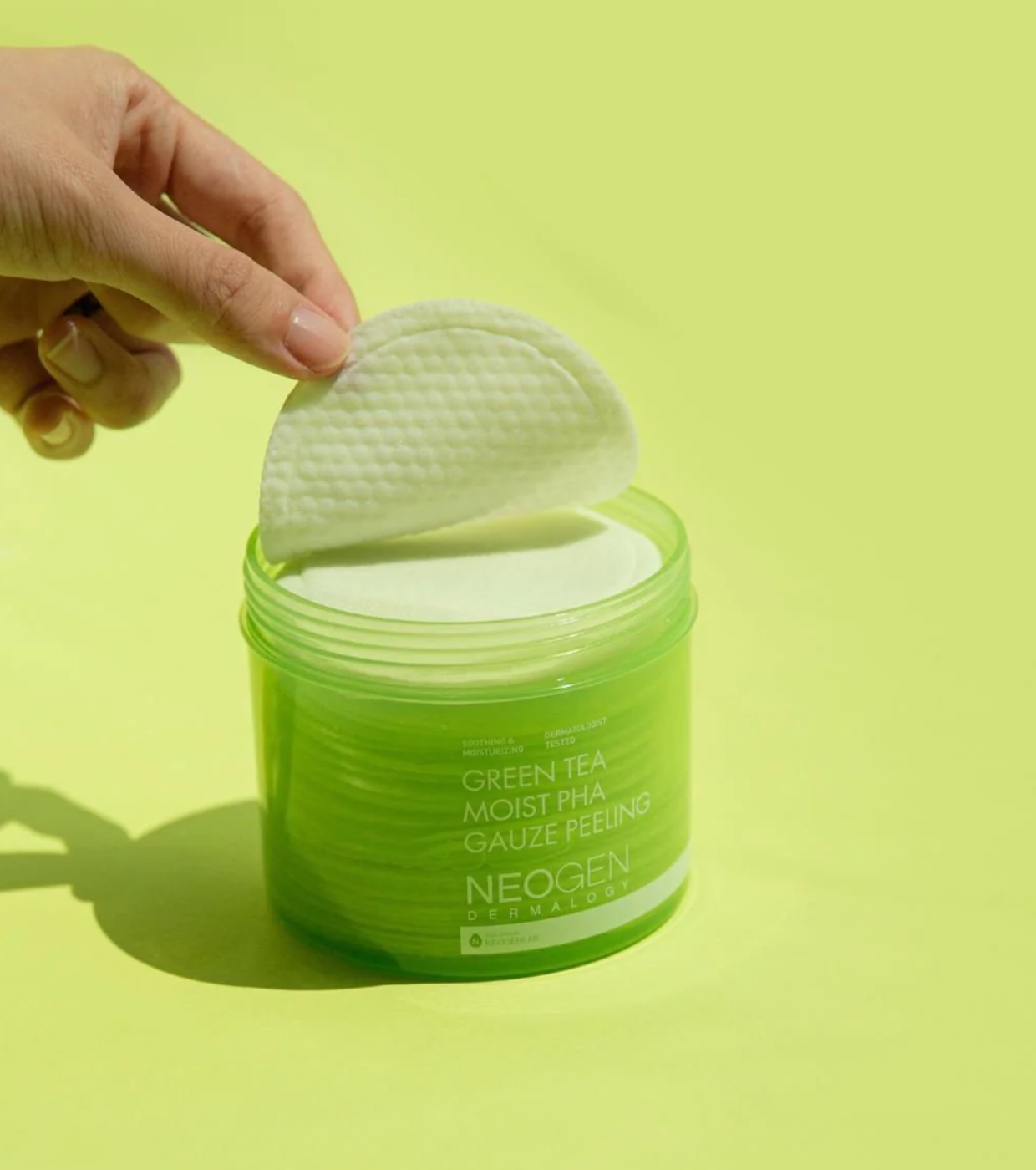 Os discos esfoliantes Green Tea Moist PHA Gauze Peeling da Neogen combinam esfoliação suave, hidratação intensa e ação calmante para deixar a pele mais macia, fresca e equilibrada.