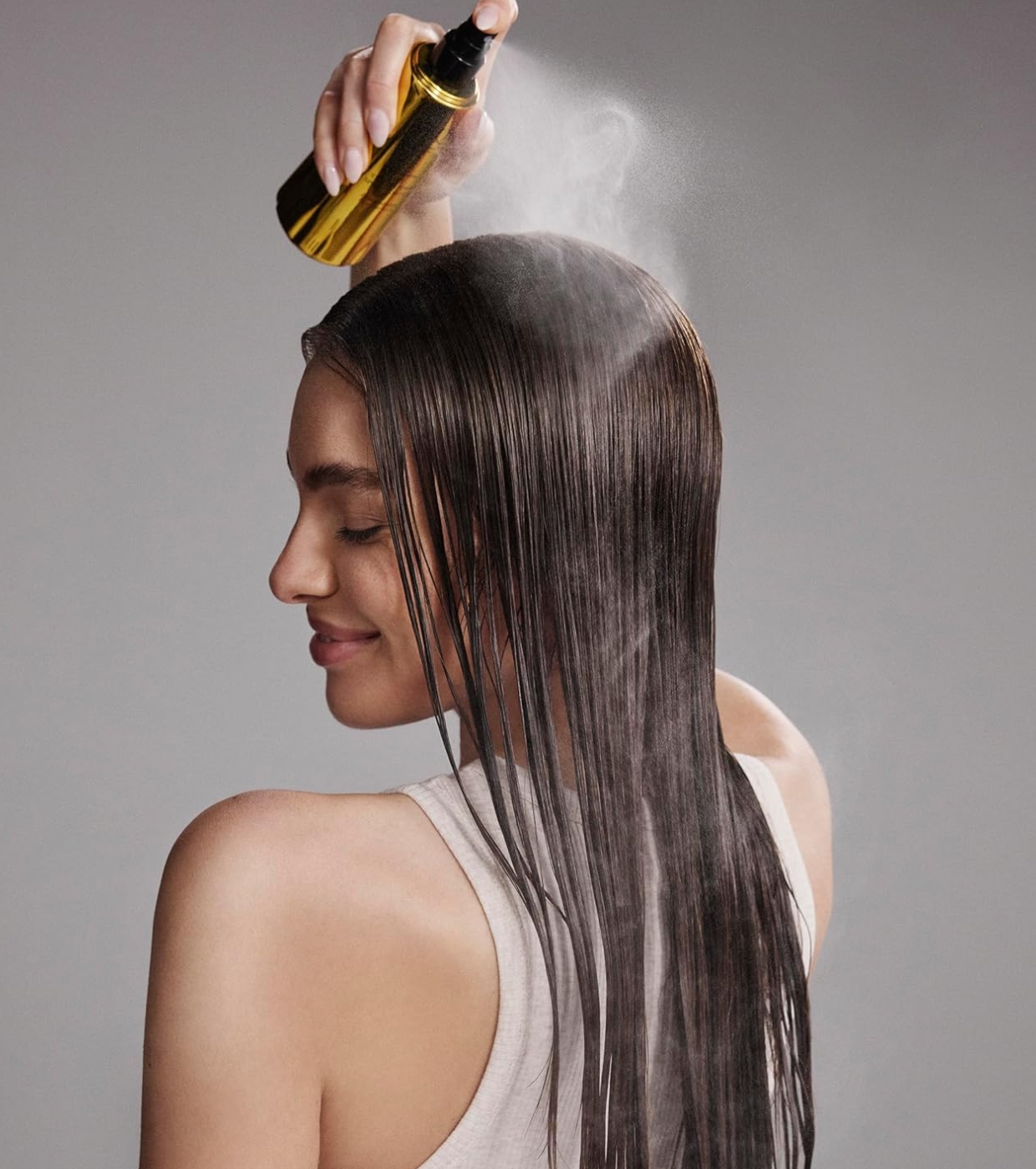 2. Borrife o spray generosamente e uniformemente no cabelo seco com toalha (não molhado).