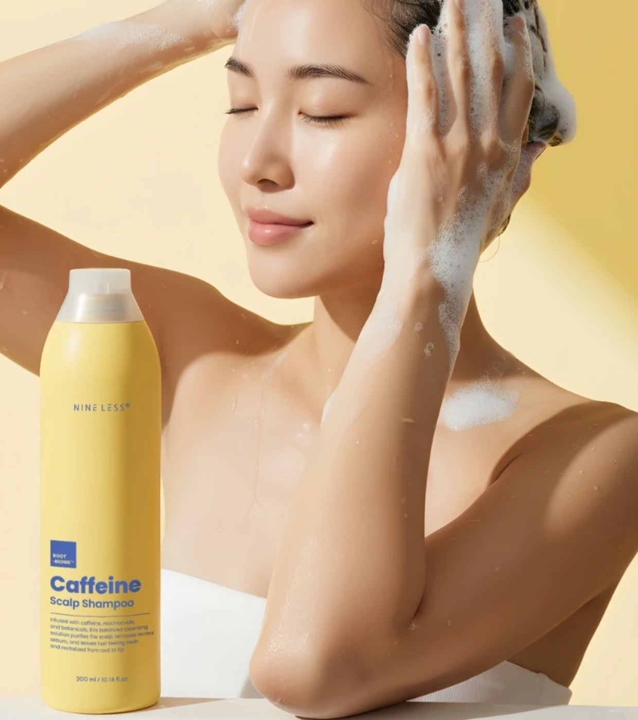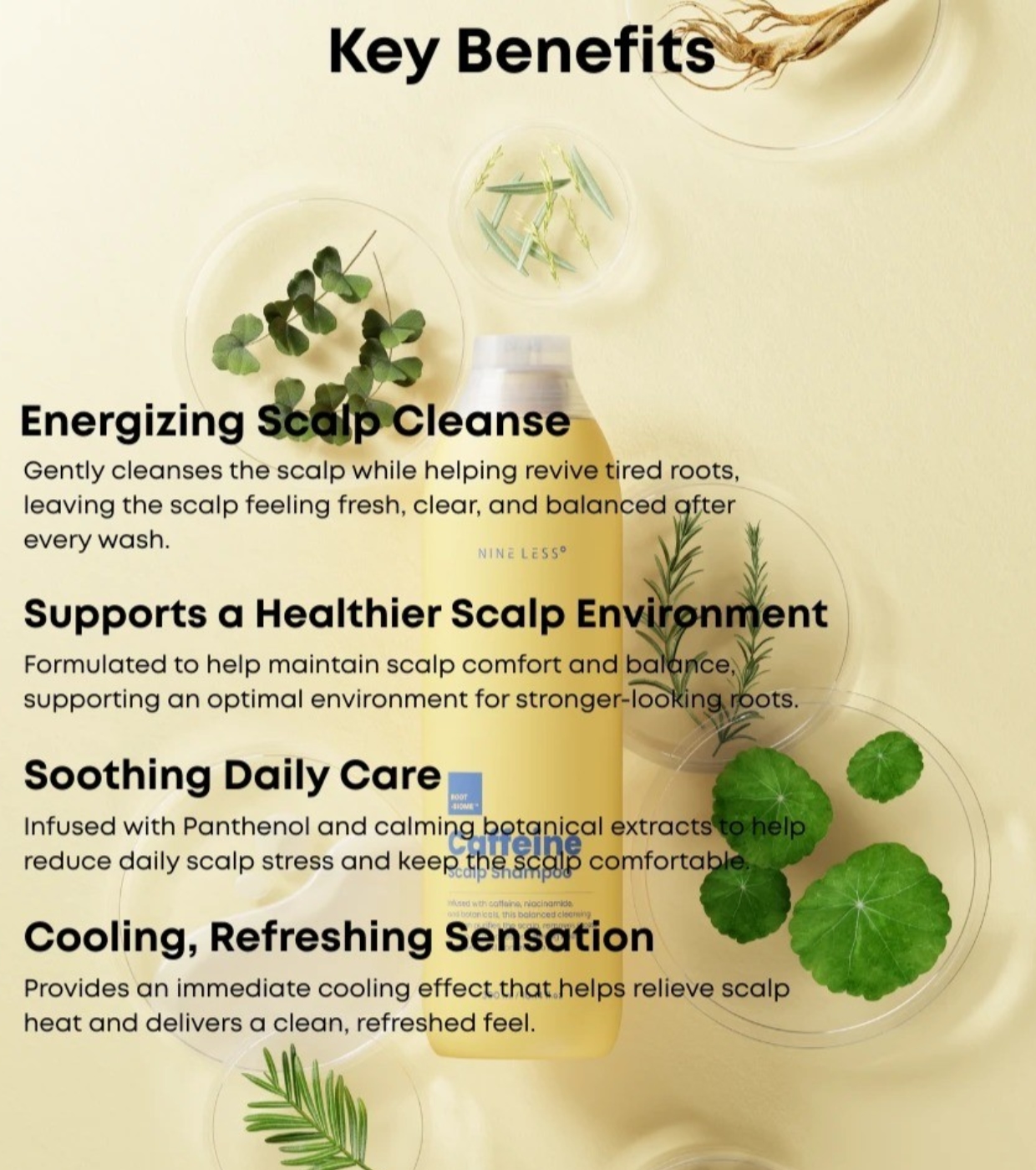 Este shampoo para o couro cabeludo da Nineless limpa e refresca, sendo formulado para restaurar o equilíbrio natural e fortalecer as raízes do cabelo desde a primeira utilização.