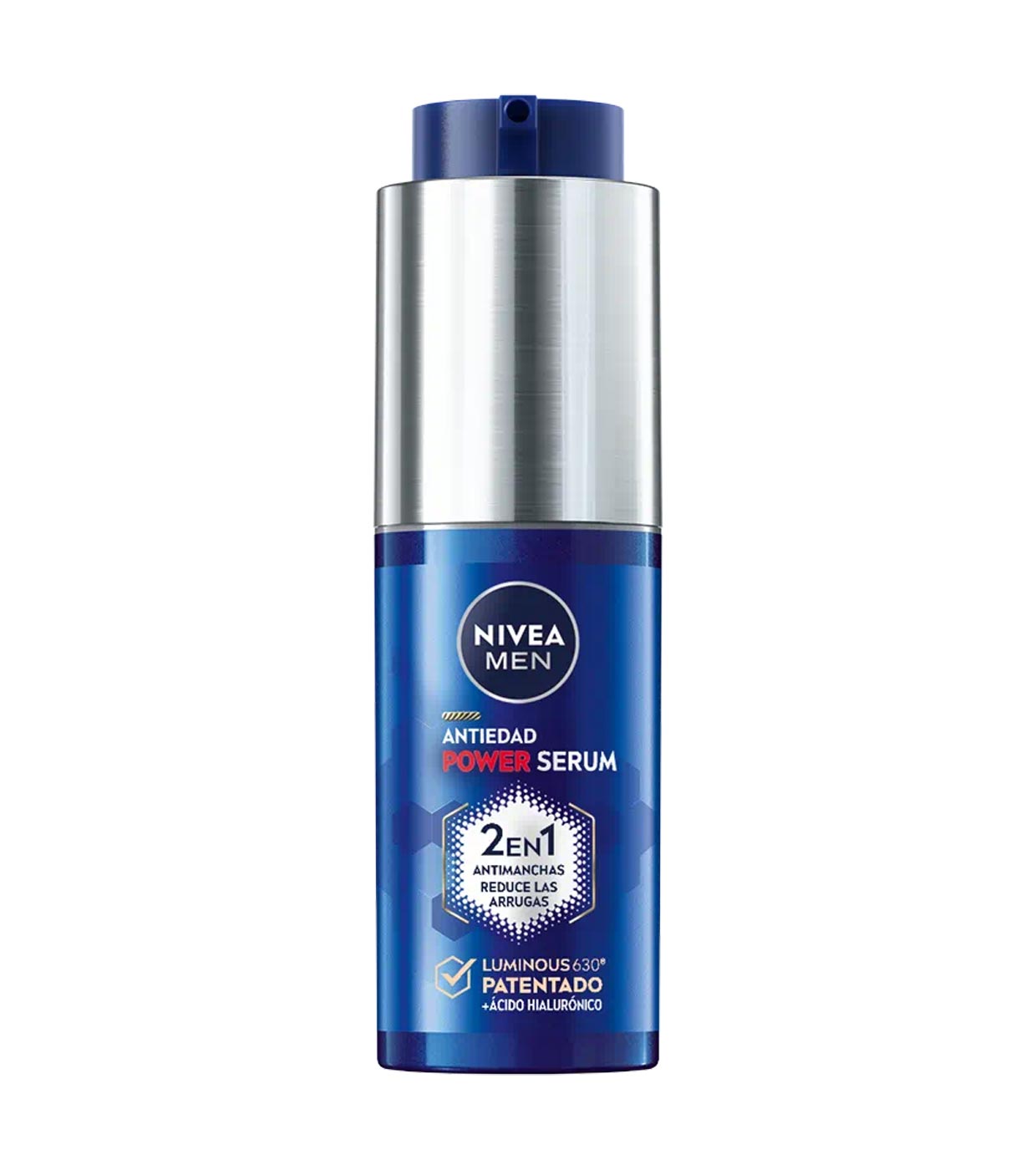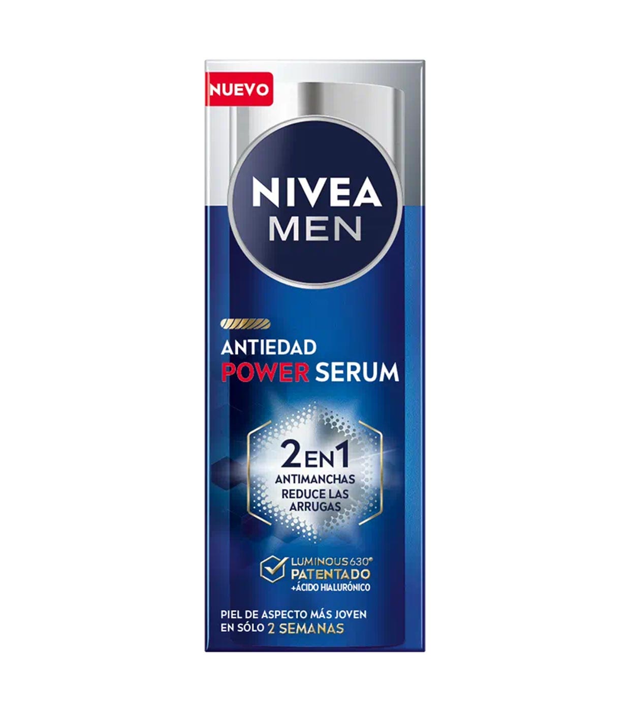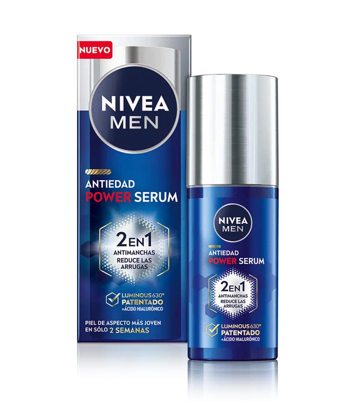Sérum antienvelhecimento Nivea Men Power Serum 2 em 1 combina ácido hialurônico em sua fórmula com o ingrediente anti-manchas patenteado Luminous630 que oferece redução avançada de manchas e efeito antienvelhecimento.