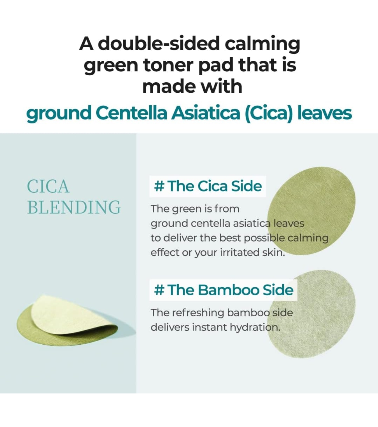 - Textura dupla: Cica Side: Com folhas inteiras de Centella Asiatica que proporcionam relevo profundo; Lado de Bambu: Rico em água purificante para hidratar e acalmar rapidamente.