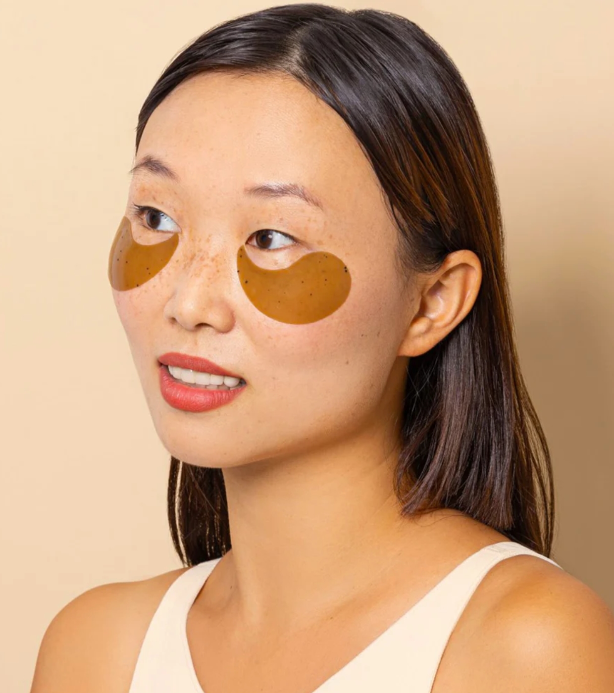 Tapa-olhos de hidrogel com cafeína e chá verde que reduzem o aparecimento de rugas, olheiras e papos ao redor dos olhos.
