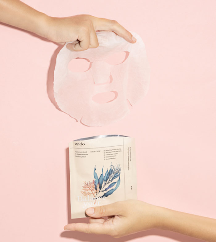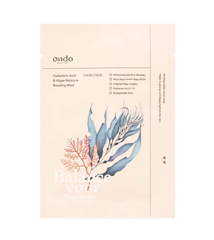 La Mascarilla Hidratante Chok-Chok Hyaluronic Acid & Algae de Ondo Beauty 36.5 está fabricada con un tejido biodegradable y contiene un 88% de agua de hamamelis, complejo de 8 plantas marinas y niacinamida, los cuales ayudan a rellenar e hidratar profundamente a pele.