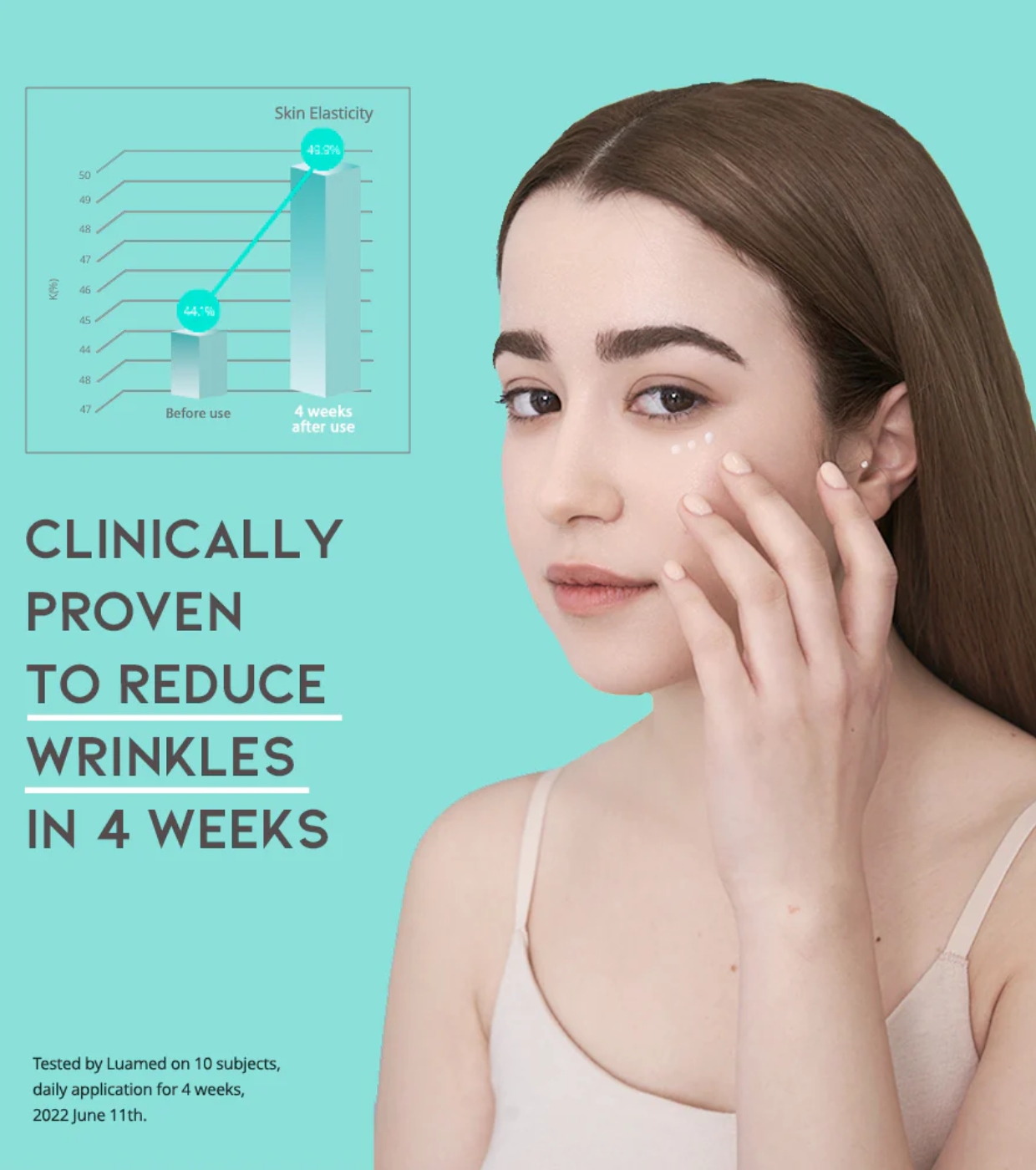 - Efeito rejuvenescedor – Suaviza linhas finas e melhora a textura do contorno dos olhos.