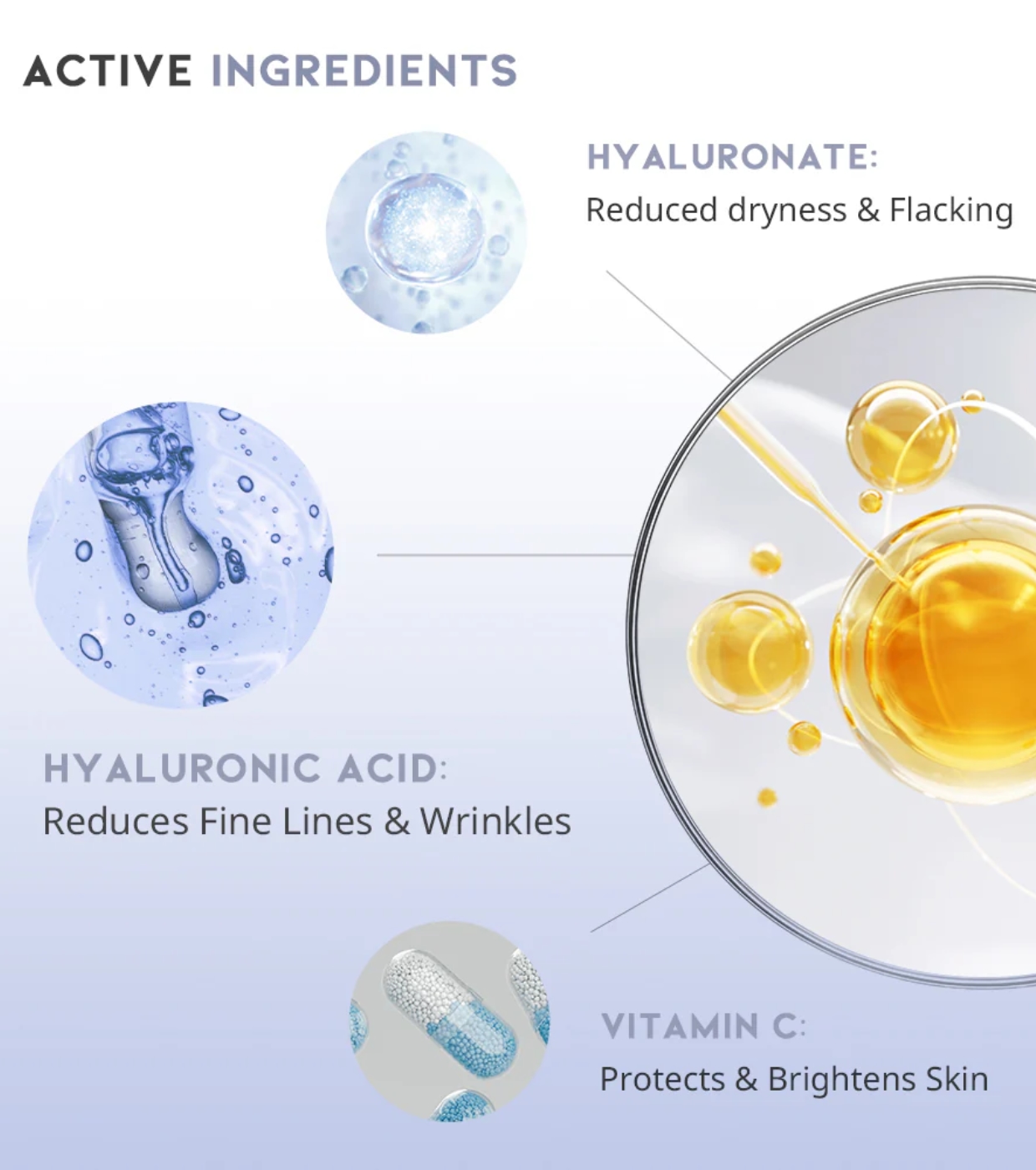 - 8 moléculas de ácido hialuronano – Hidrata em diferentes níveis da pele para máxima retenção de umidade.