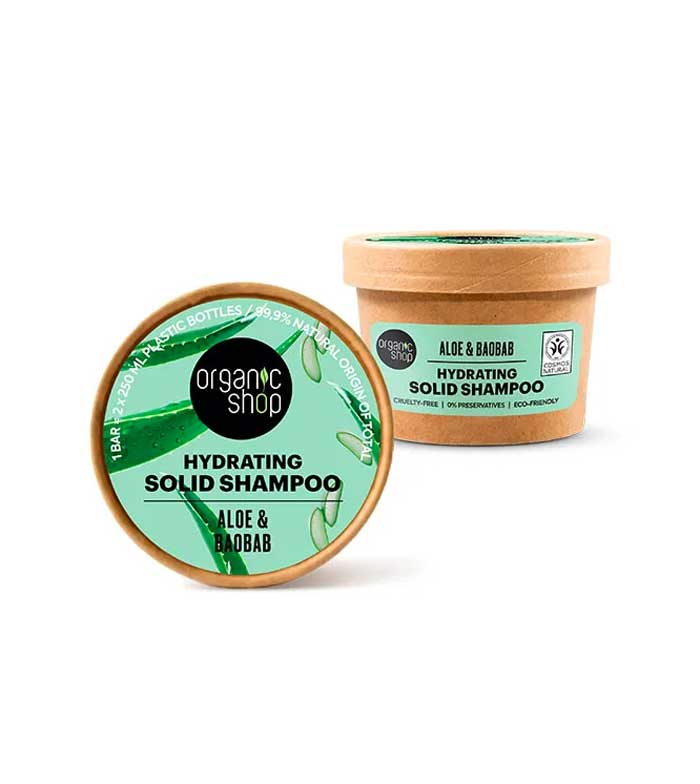 Shampoo hidratante sólido da Organic Shop com extrato de aloe e baobá.