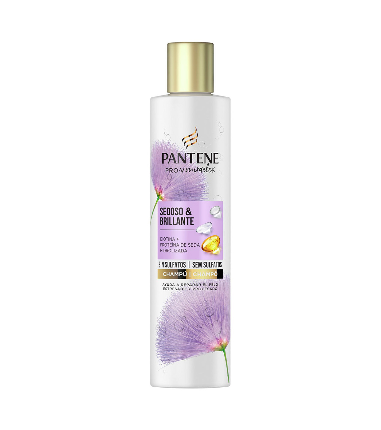 O shampoo Silky & Shiny sem sulfatos Pro-V Miracles com biotina + proteína de seda hidrolisada é ideal para cabelos excessivamente danificados e com mechas.