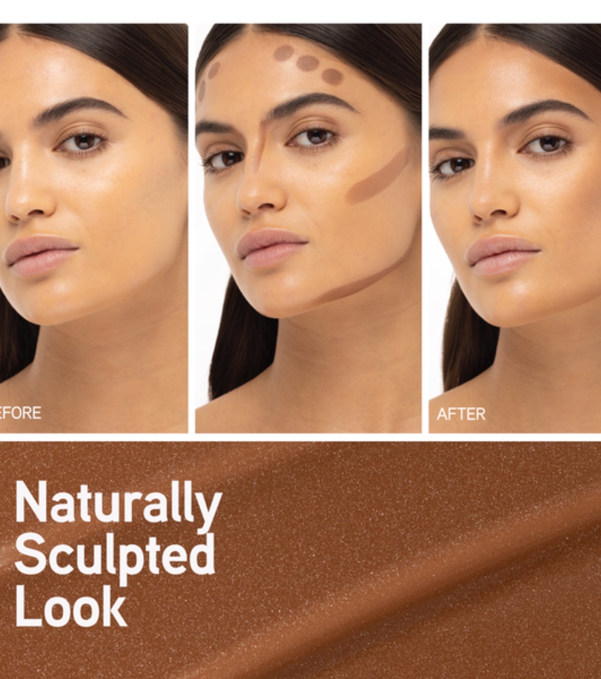 O aplicador em forma de almofada distribui o produto uniformemente para definir características e obter um contorno natural.