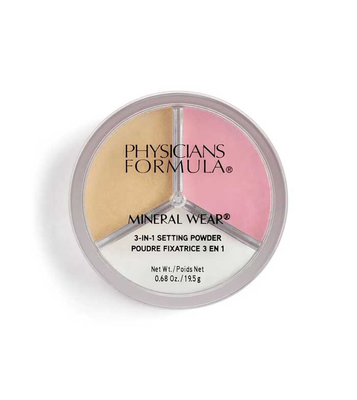 Pó para selar a maquiagem Mineral Wear, com três tonalidades diferentes.