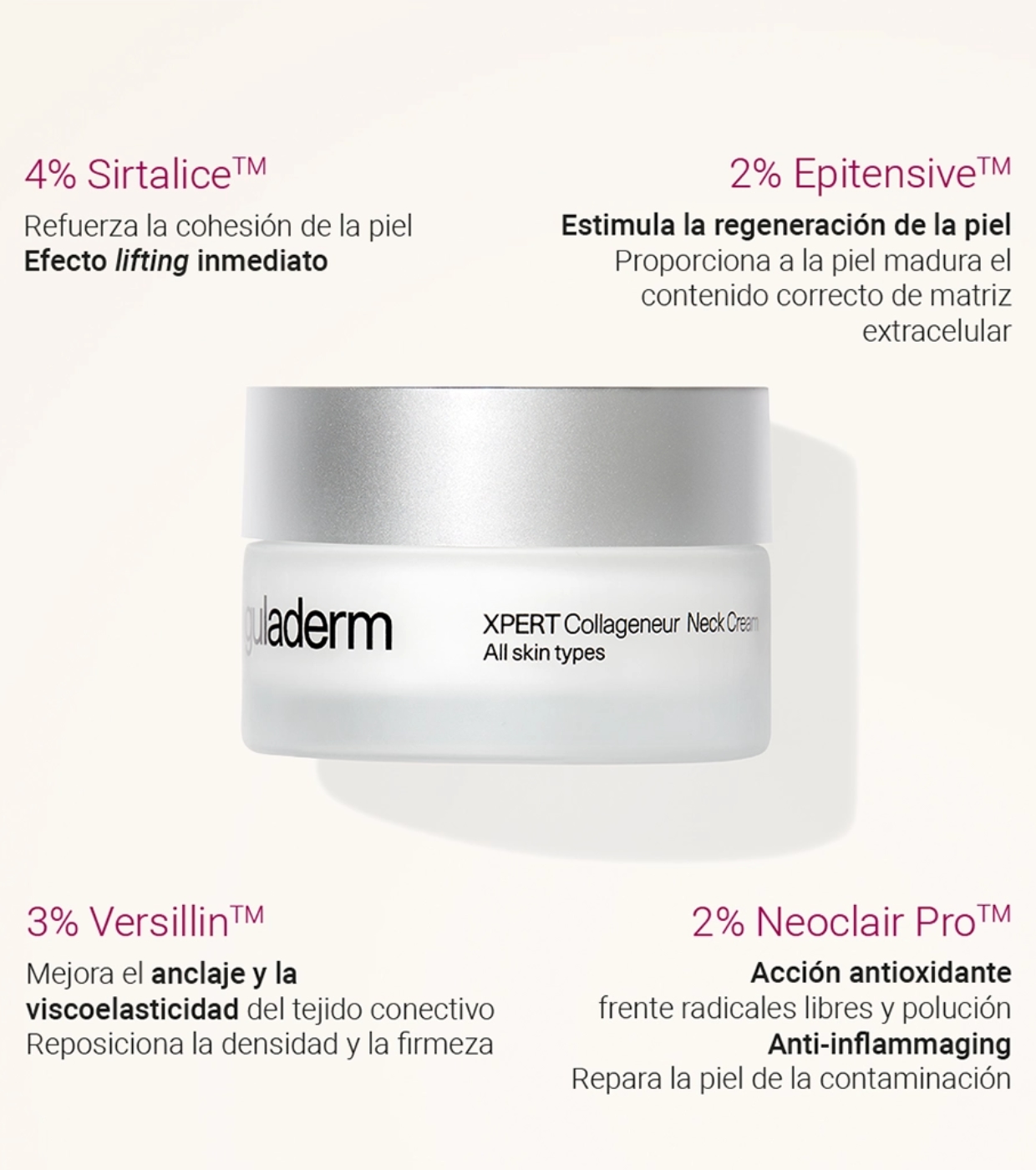 Descubra o creme XPERT Collageneur da Primaderm com textura rica, rápida absorção e ação intensiva, especialmente formulado para firmar e esticar a pele delicada do pescoço e do decote.