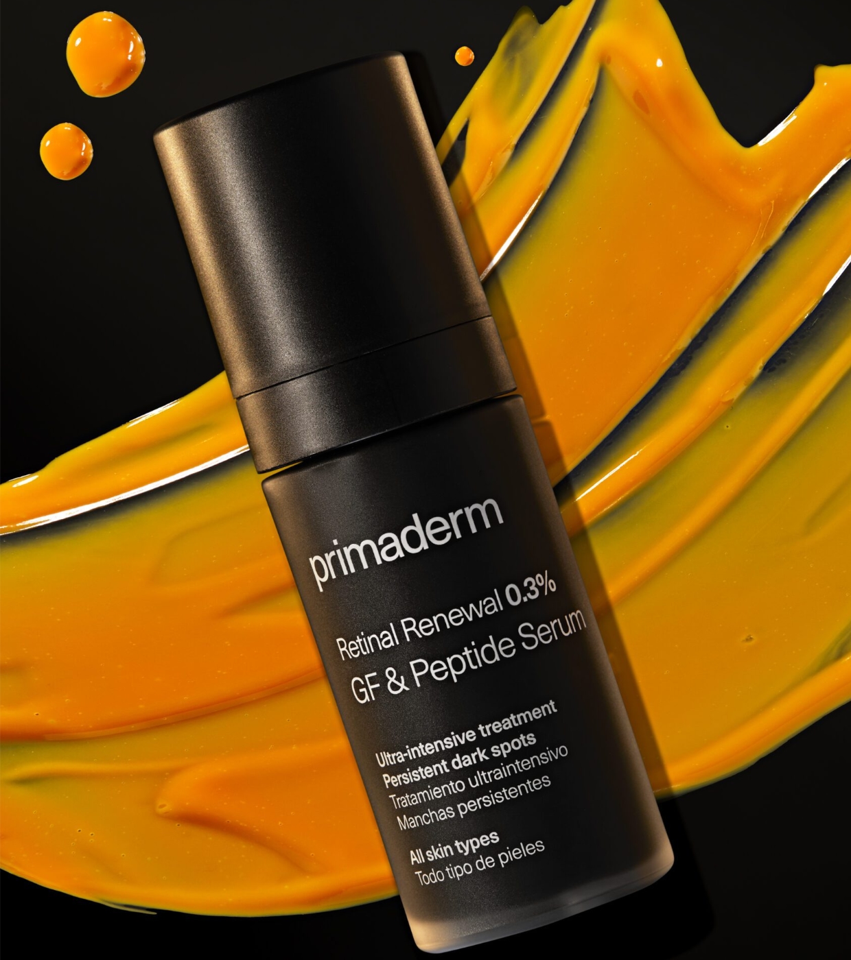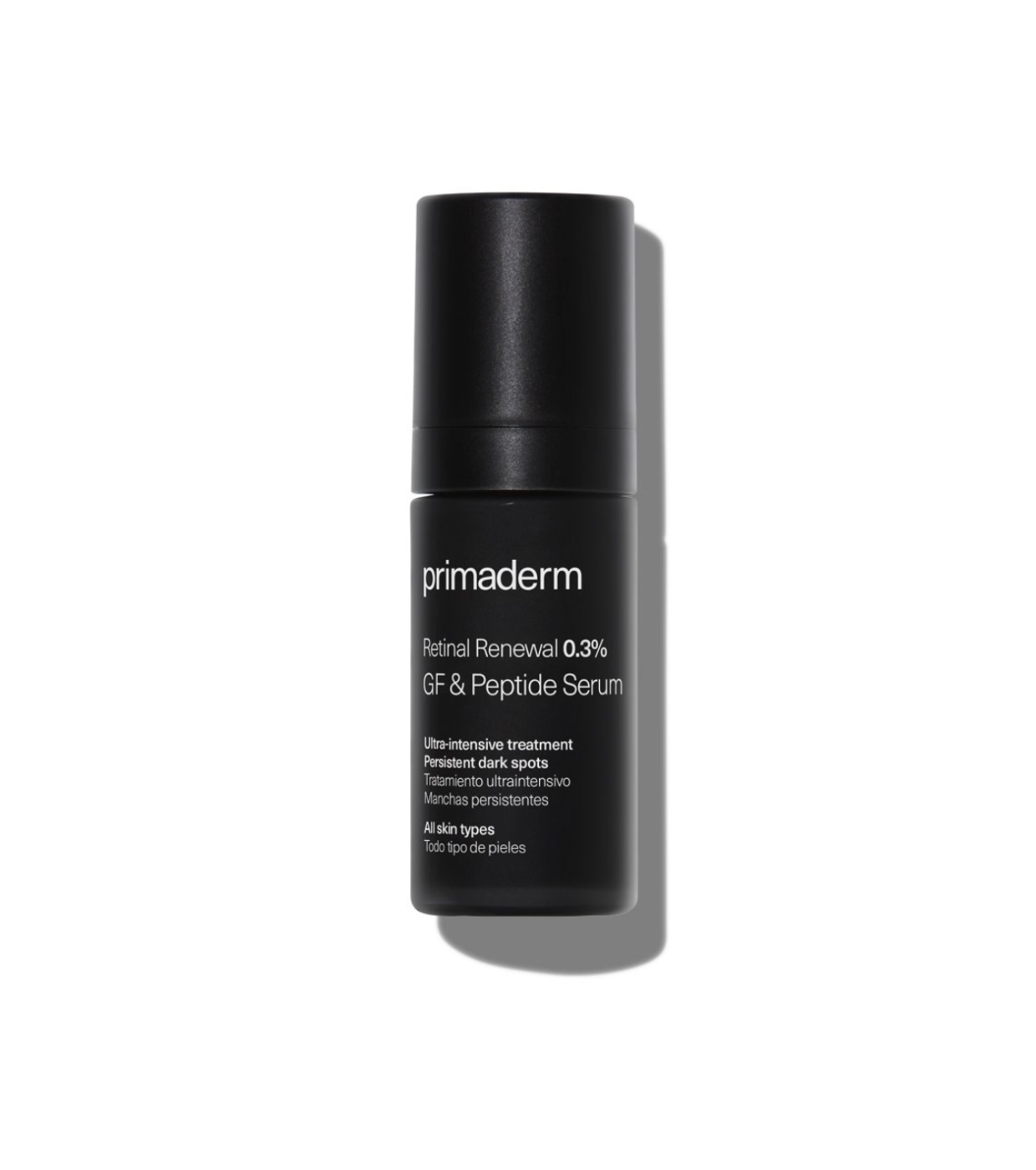 O Retinal Renewal 0.3% GF & Peptide Serum da Primaderm modula de forma inteligente os mecanismos de proteção, renovação e despigmentação, oferecendo uma estratégia terapêutica abrangente para rejuvenescer visivelmente a pele.