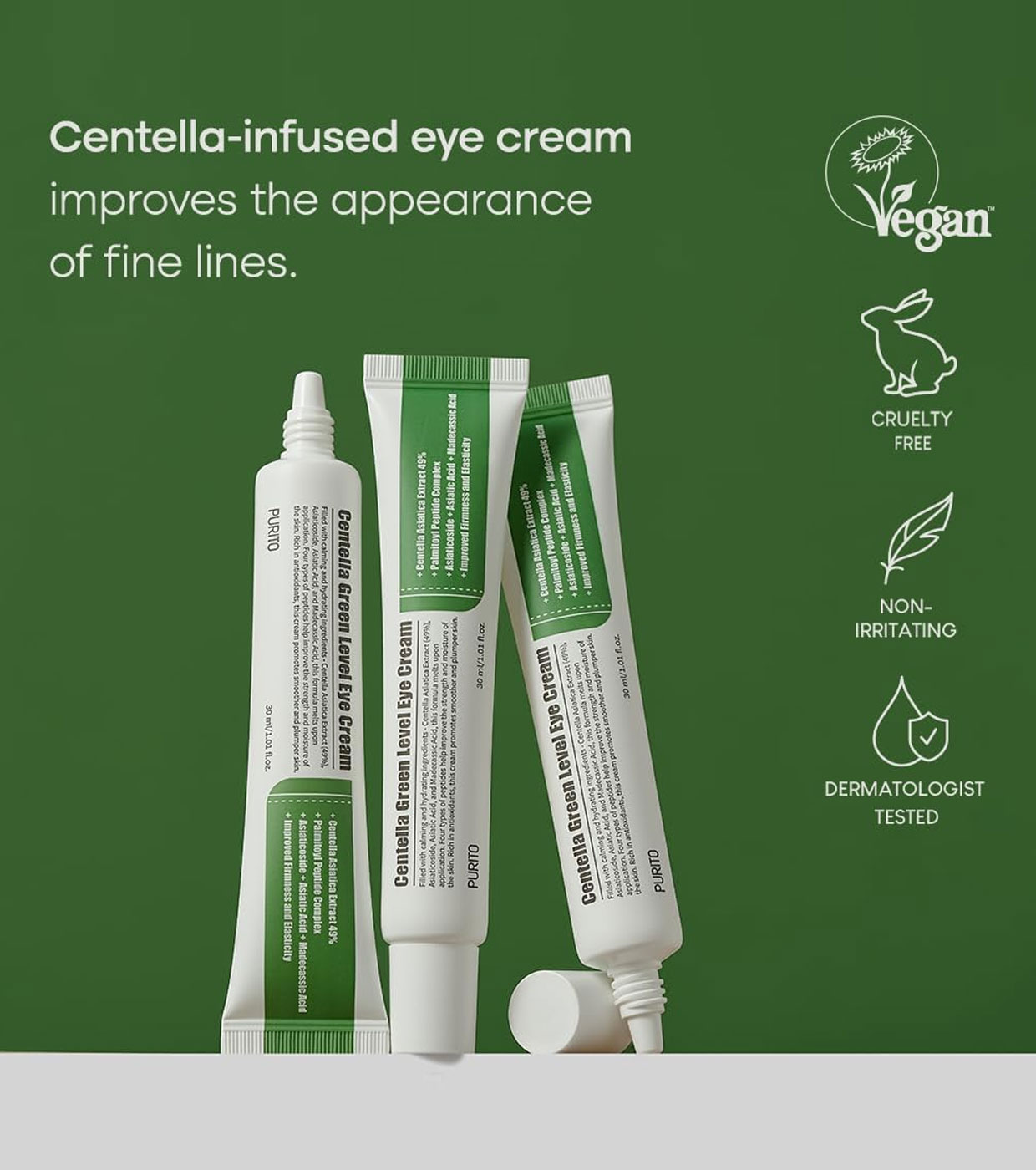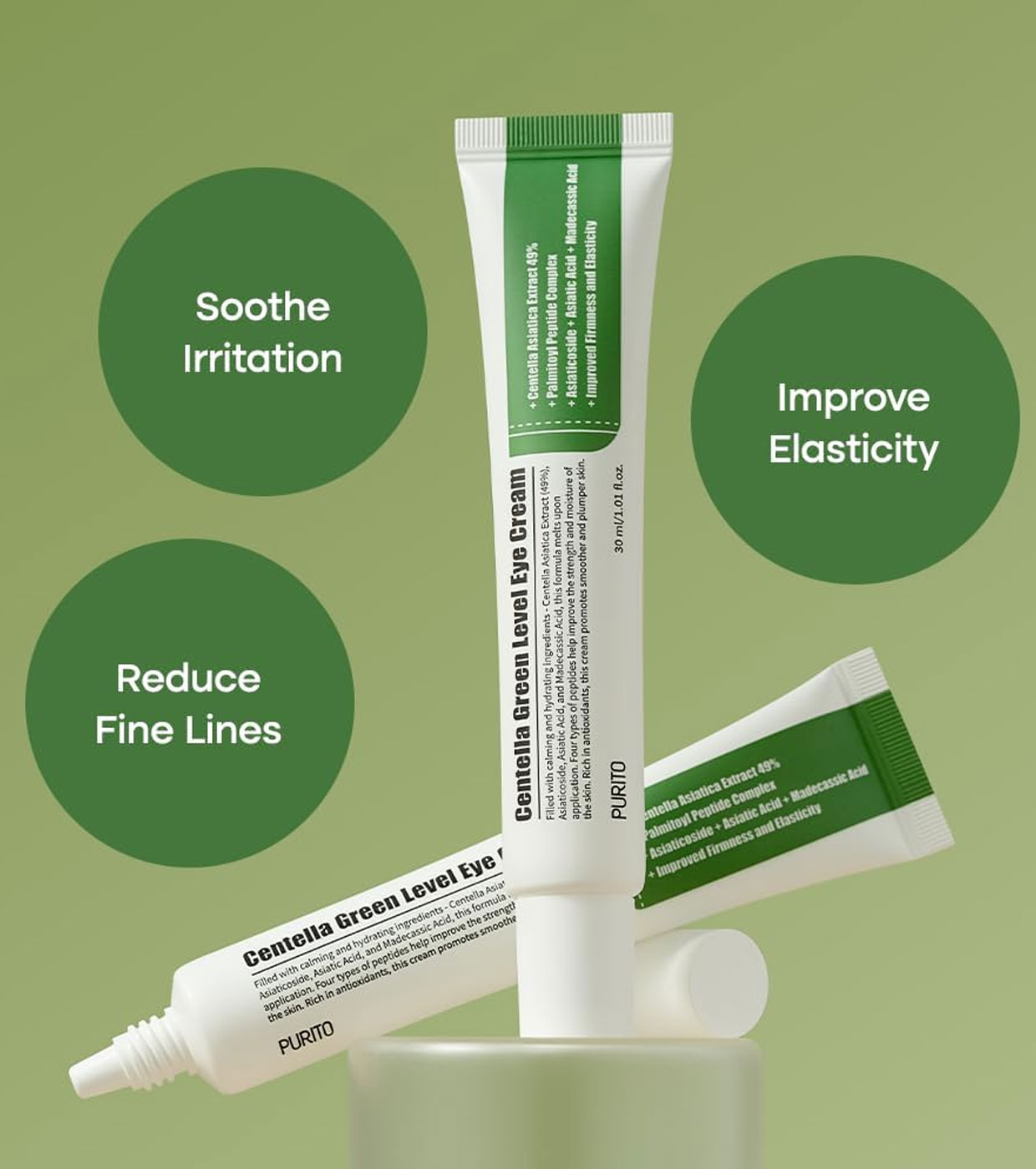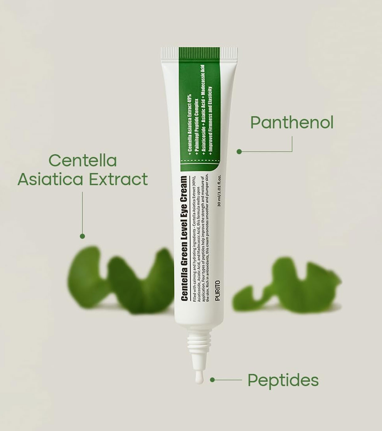 Este contorno ocular contém 49% de extrato de centella asiática.