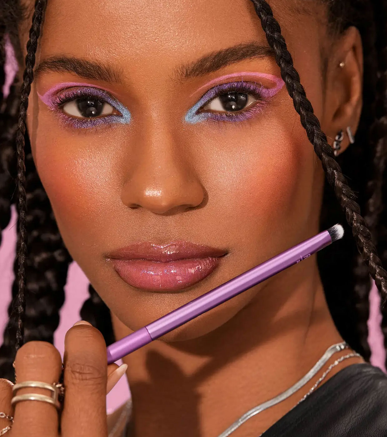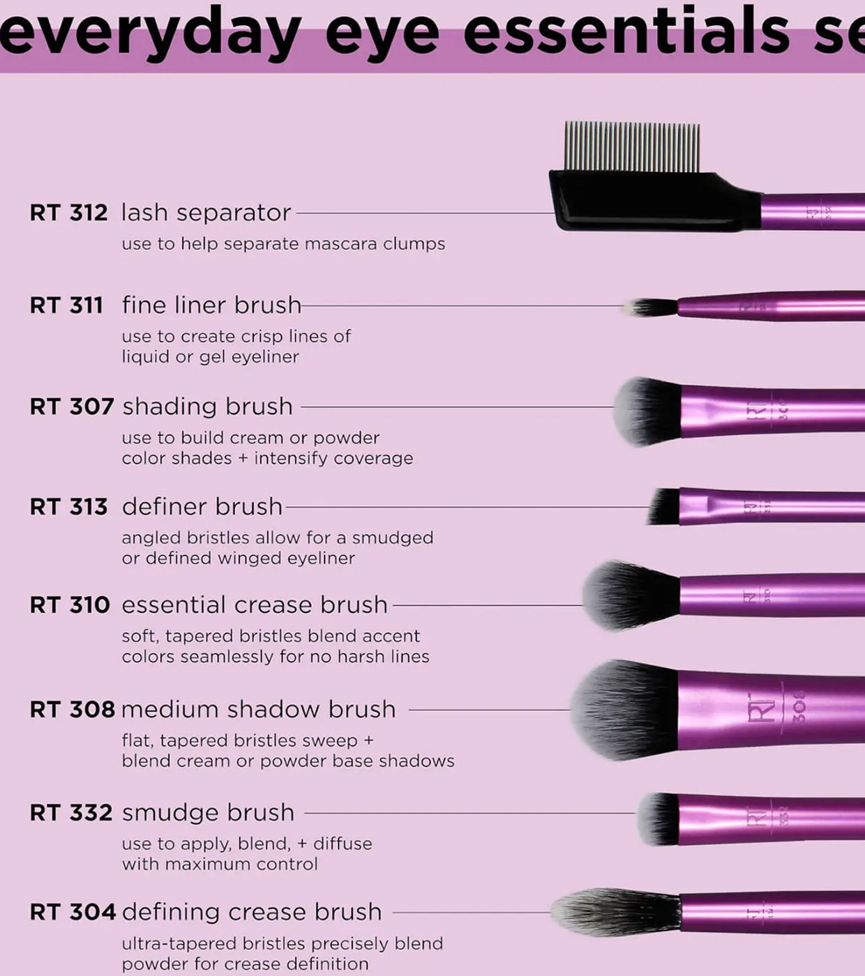 Cada pincel é projetado para uma tarefa específica e possui cerdas supermacias com pontas definidas, além de ponteiras e cabos elegantes em tom roxo metálico.
