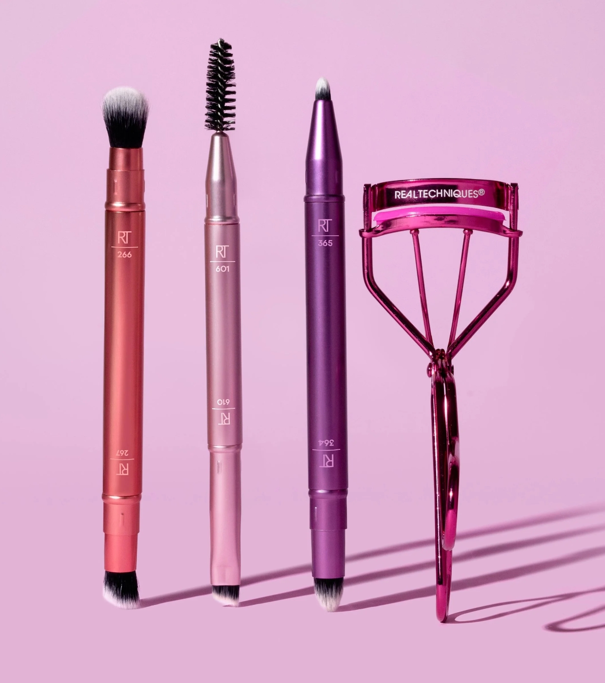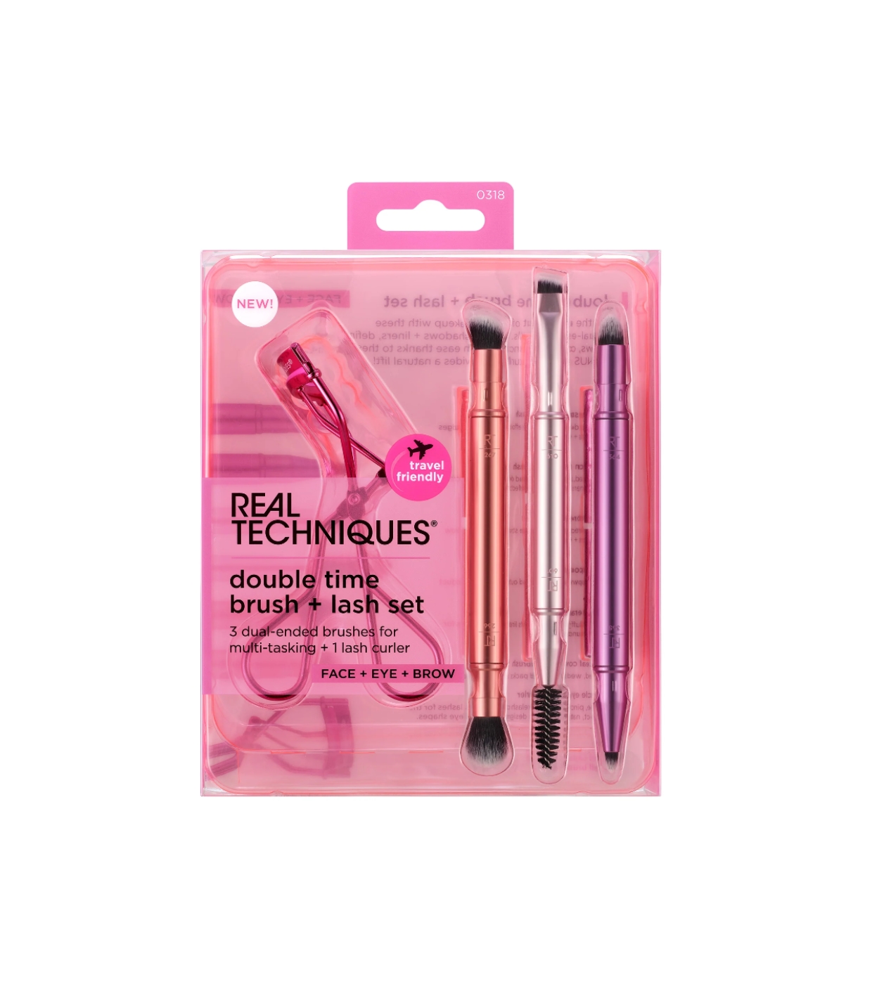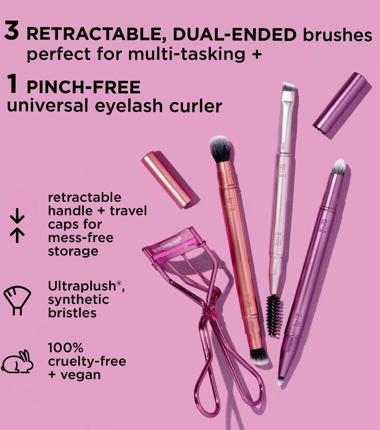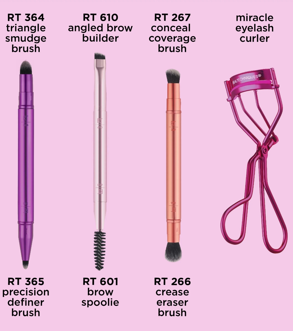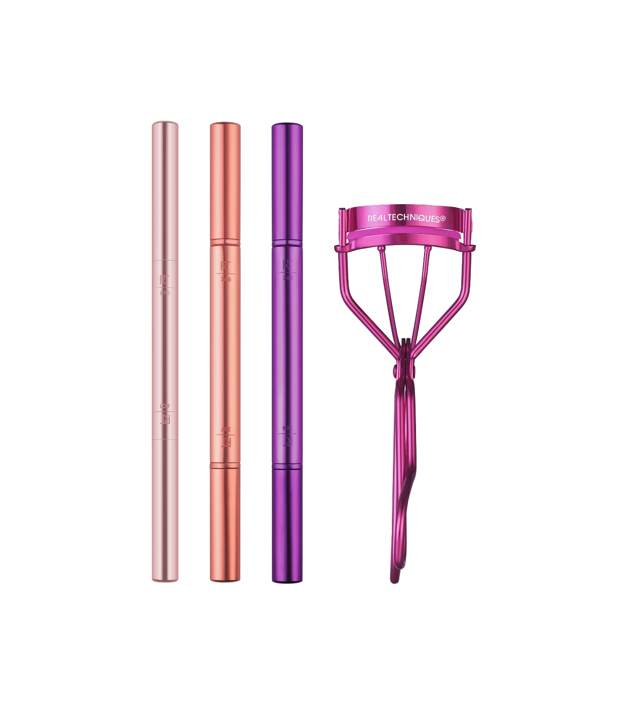Este conjunto de viagem completo Real Techniques Real Techniques inclui 3 pincéis de ponta dupla e um modelador de cílios Miracle, perfeito para definir, misturar e aperfeiçoar seus olhos em qualquer lugar.