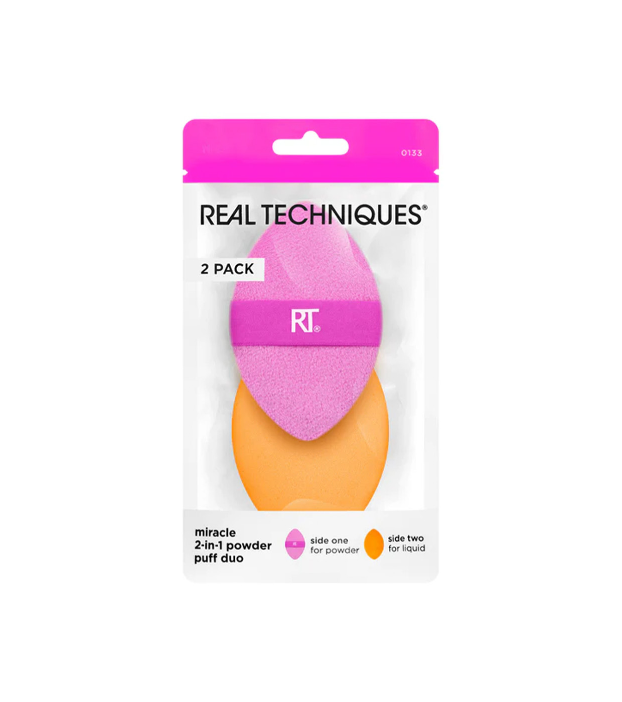 Real Techniques Miracle 2-in-1 Powder Puff é um puff de maquiagem multiuso de textura dupla projetado para trabalhar com pós, líquidos e cremes para uma base suave e perfeitamente definida.