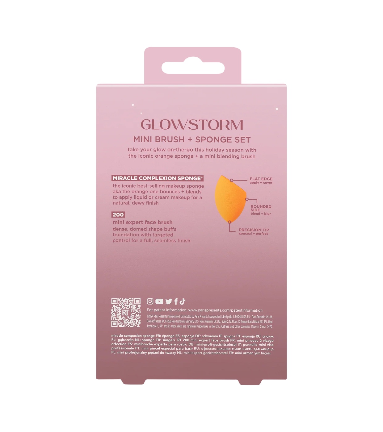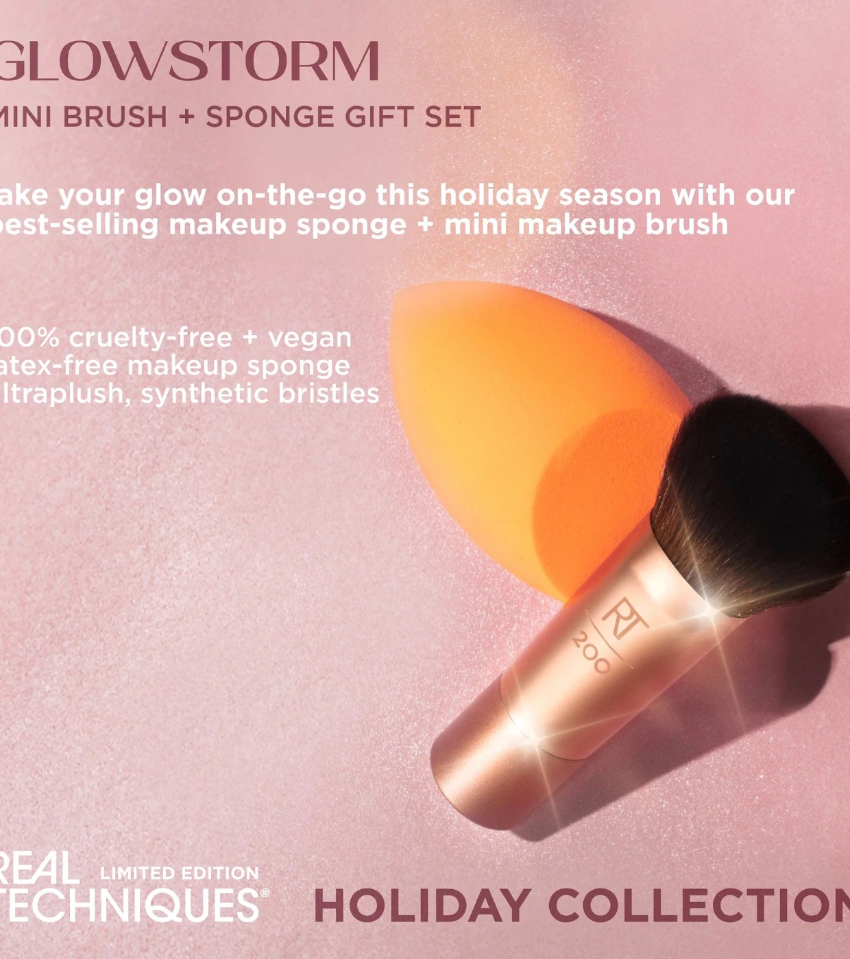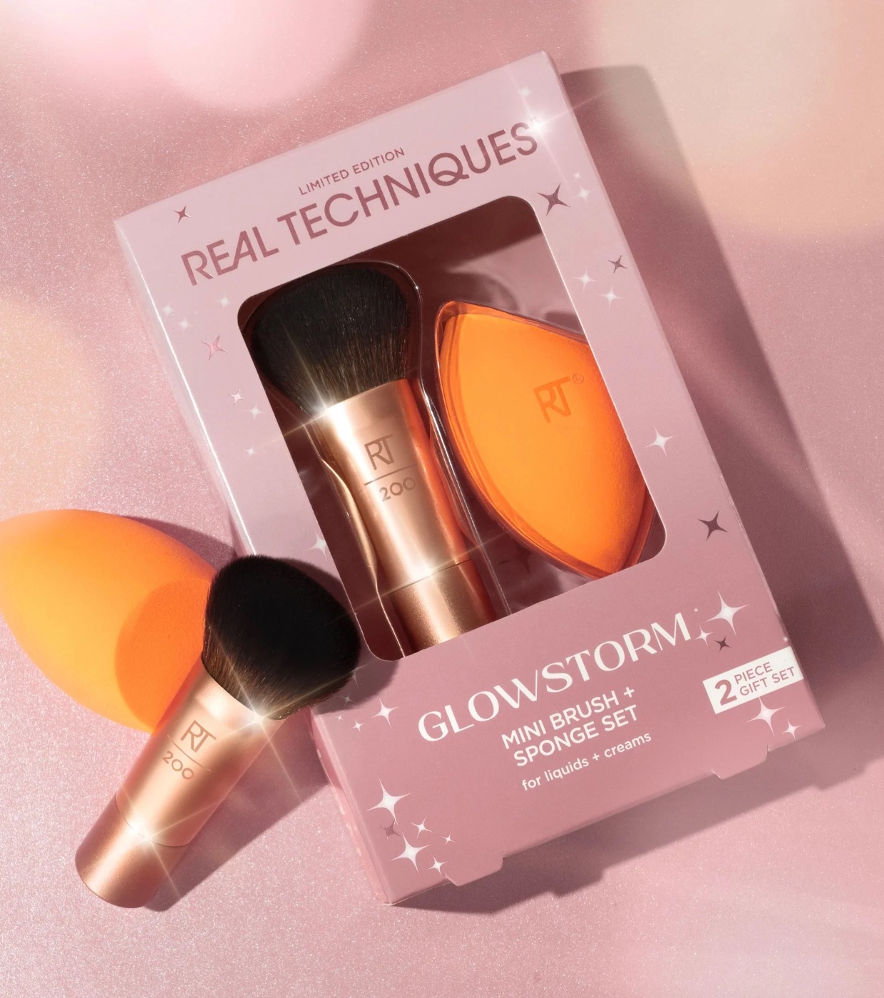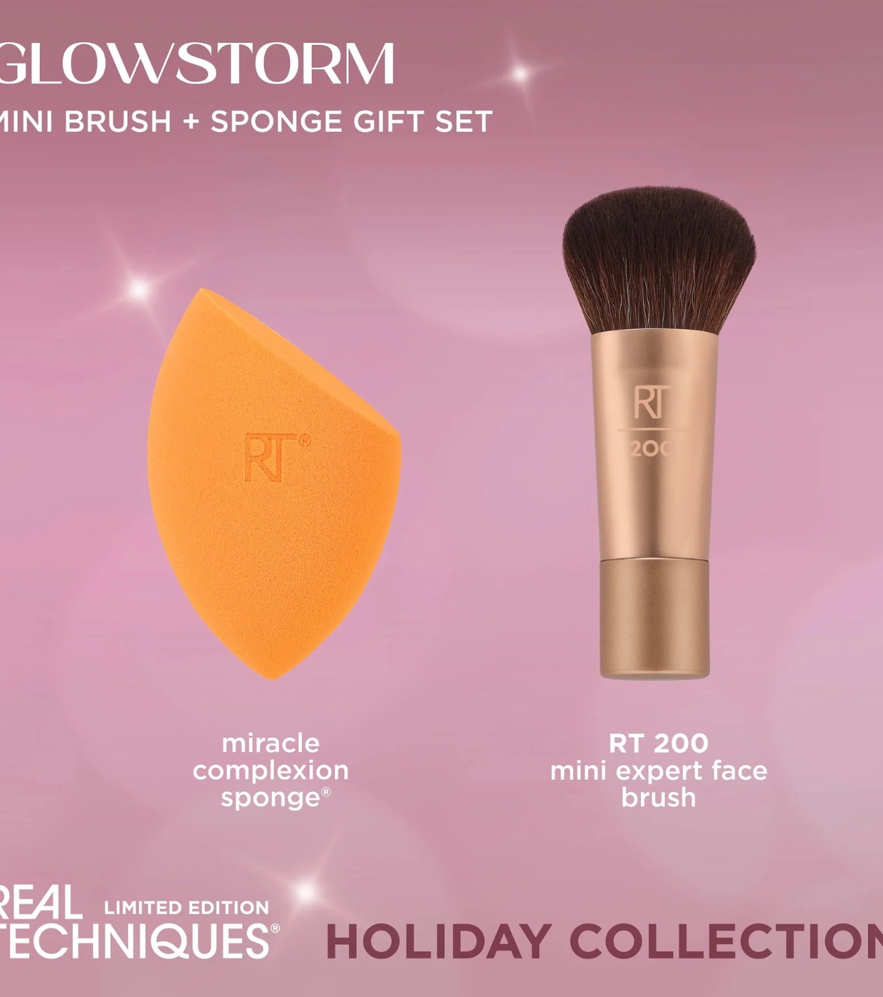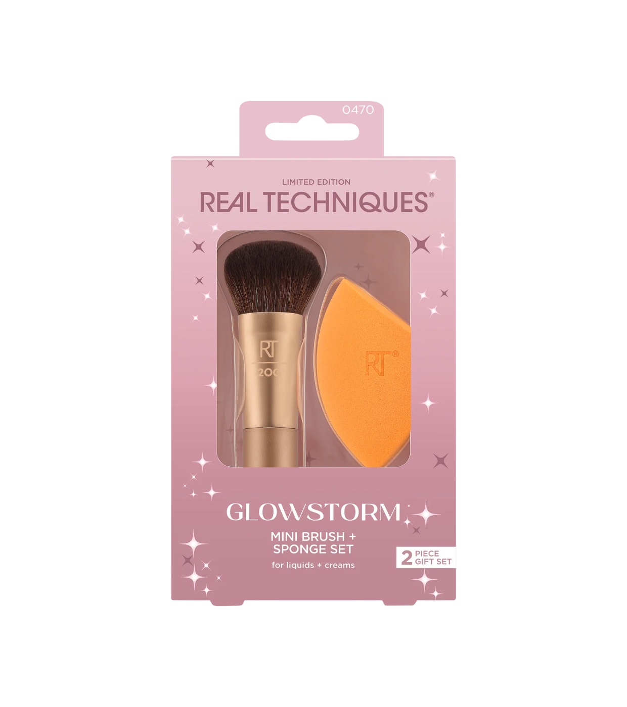 Conjunto mini pincel + esponja Glowstorm Holidays 24 Real Techniques : Edição limitada para um acabamento radiante.
