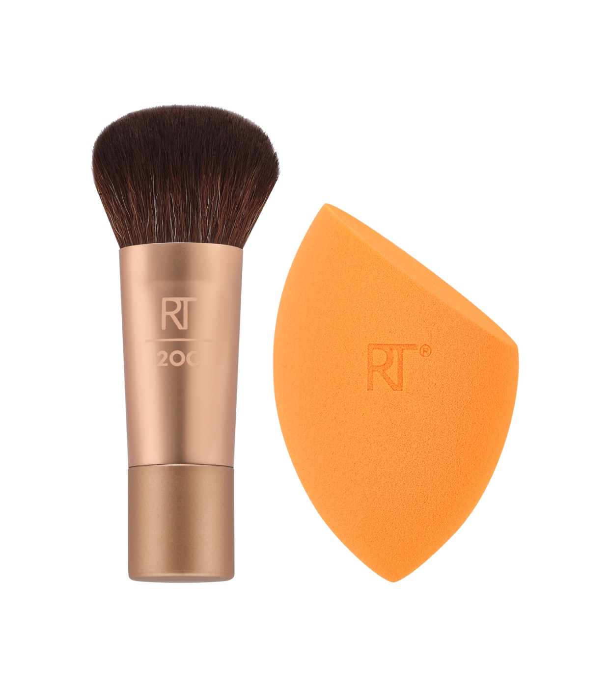 Este conjunto inclui nossa icônica esponja de maquiagem laranja e um mini pincel de base, projetados para trabalhar com fórmulas líquidas e cremosas.