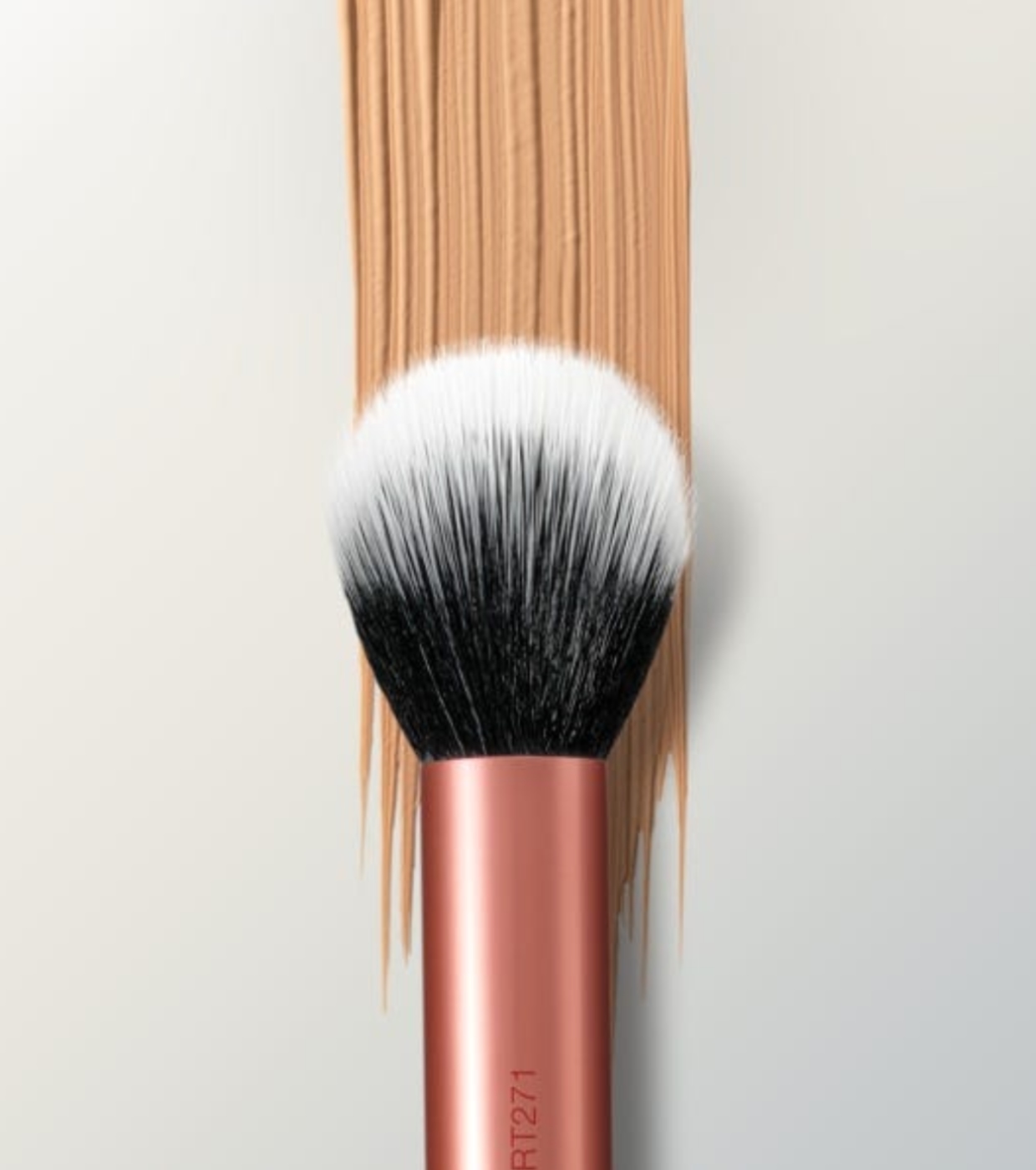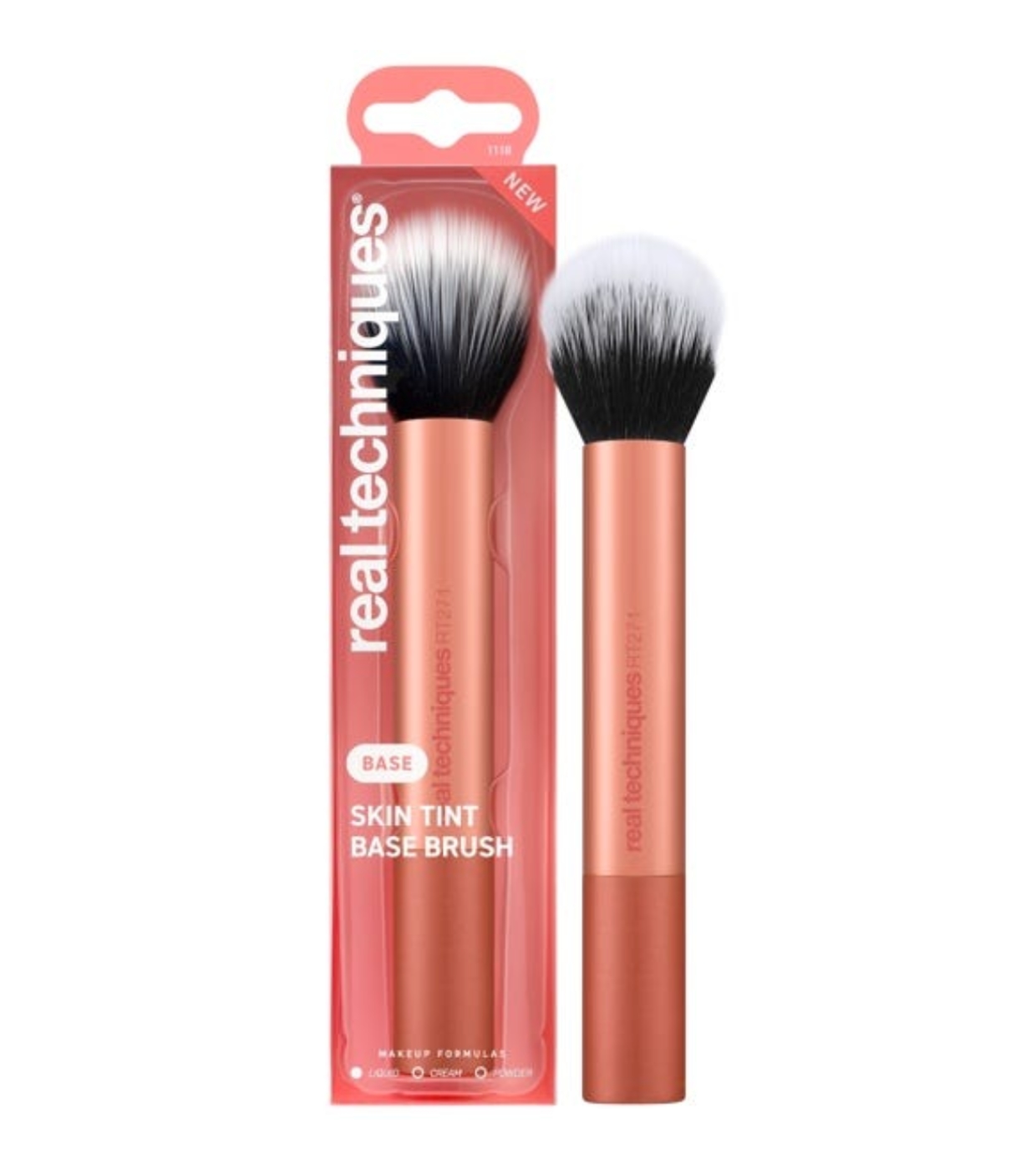 O pincel Skin Tint Base Brush da Real Techniques é perfeito para aplicar e esfumar bases líquidas, proporcionando um acabamento natural e sem marcas.
