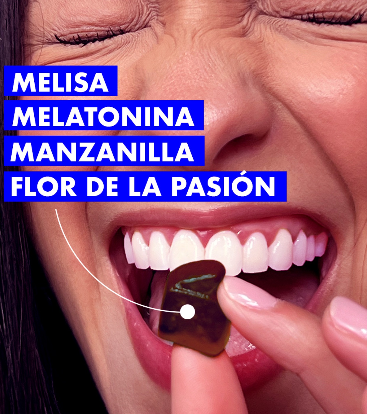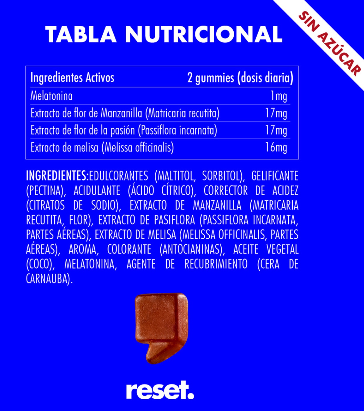 Edulcorantes (maltitol, sorbitol), gelificante (pectina), acidulante (ácido cítrico), corrector de acidez (citratos de sodio), extracto de manzanilla (Matricaria recutita, flor), extracto de pasiflora (Passiflora incarnata, partes aéreas), extracto de melisa (Melissa officinalis, partes aéreas), aroma, colorante (antocianinas), aceite vegetal (coco), melatonina, agente de recubrimiento (cera de carnauba).