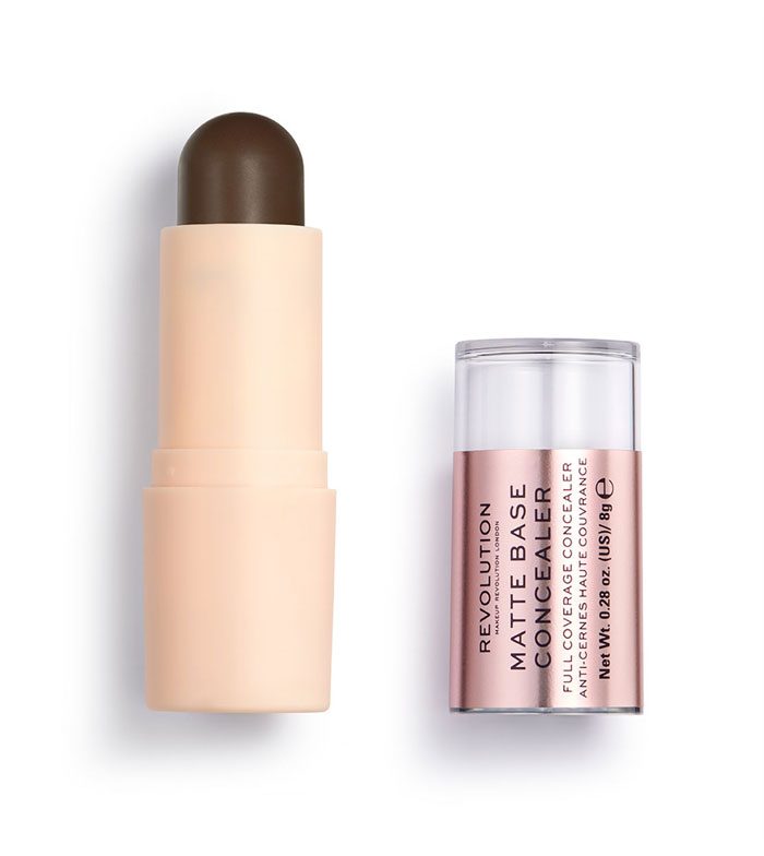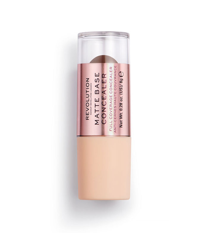 Cobre imperfeições, rugosidade da pele e olheiras, com o corretor Matte Base da Revolution.