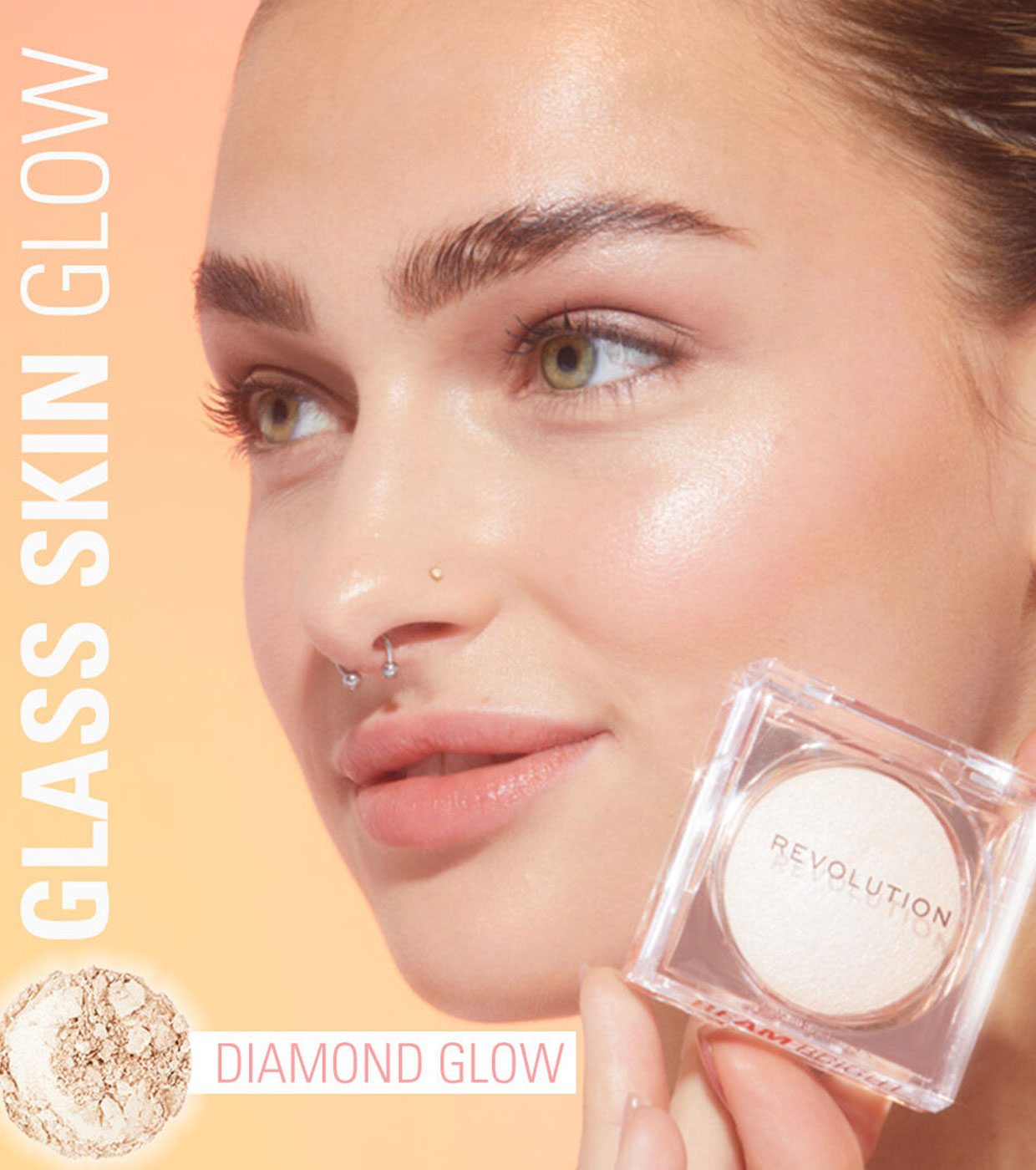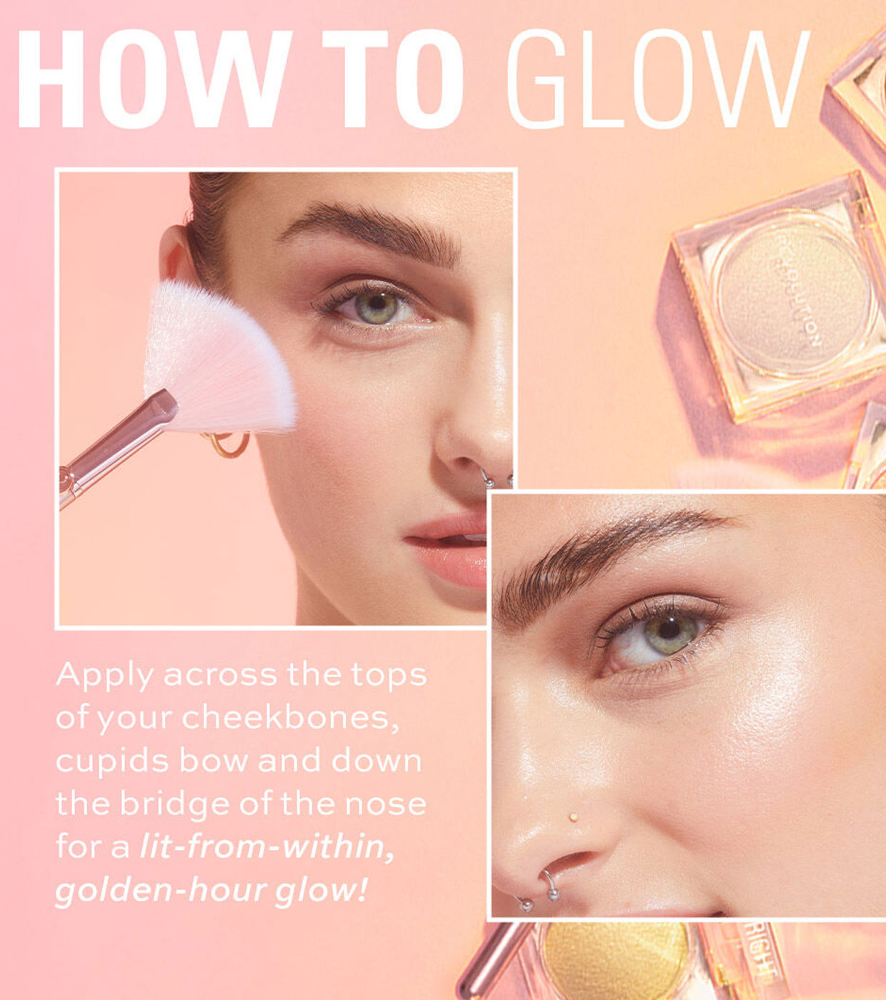 Descubra a magia dos iluminadores Revolution Beam Bright:, um pó luxuoso e sedoso que se funde na pele, criando um brilho suave e luminoso que lembra a hora dourada.