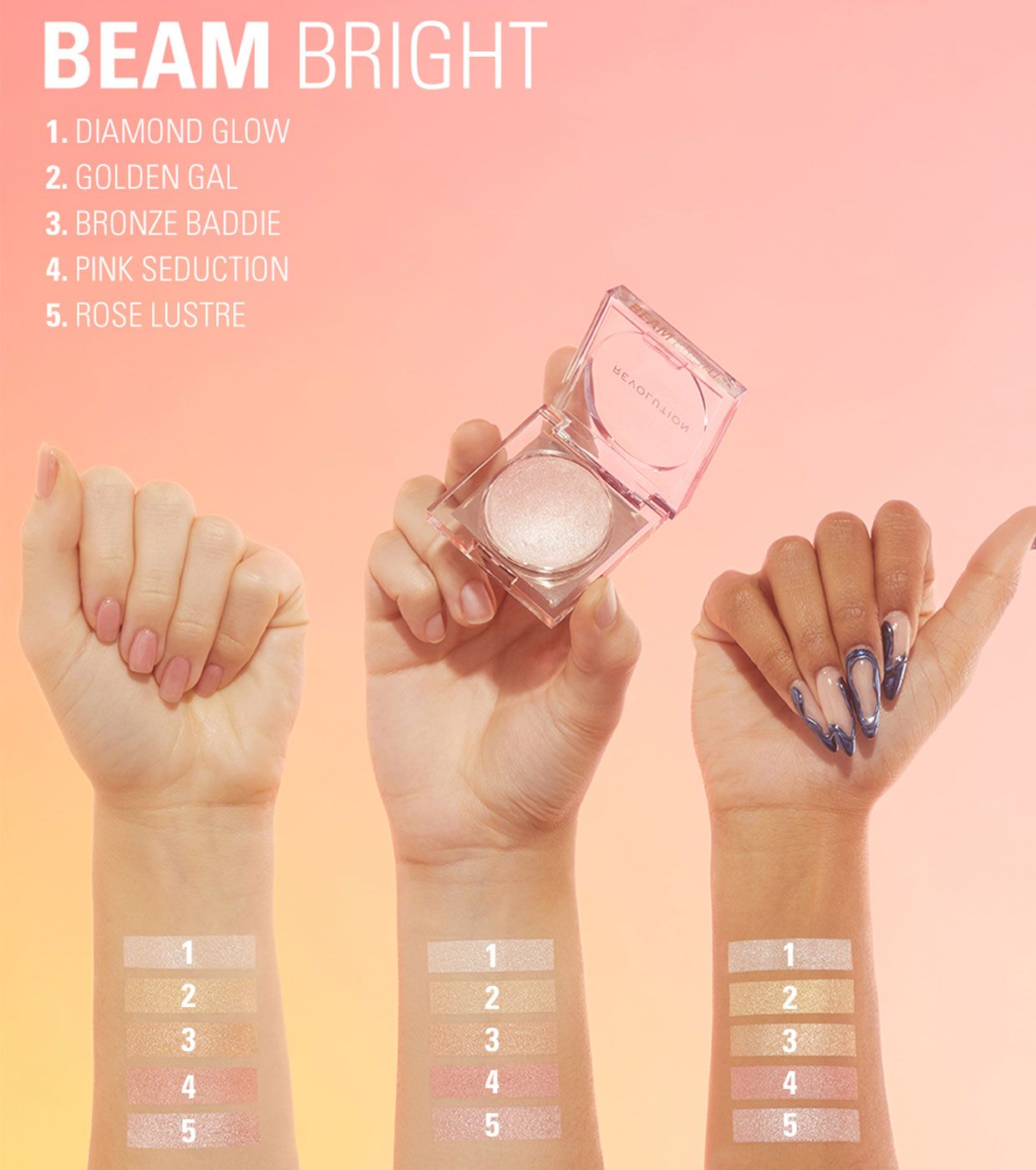 Descubra a magia dos iluminadores Revolution Beam Bright:, um pó luxuoso e sedoso que se funde na pele, criando um brilho suave e luminoso que lembra a hora dourada.