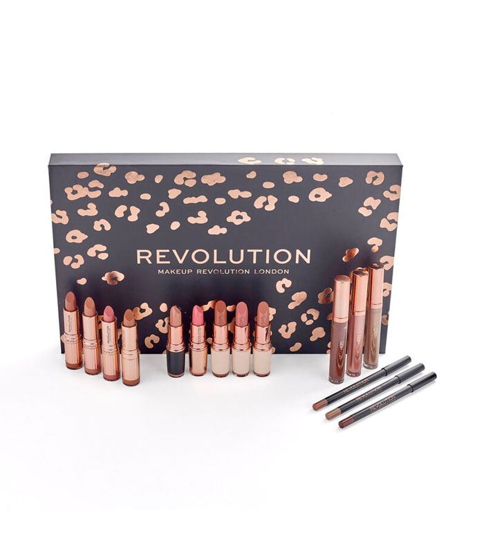 Un set regalo con 12 productos de labios en una variedad de acabados en color nude.