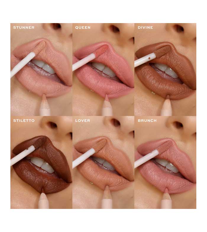 Inclui um batom líquido fosco de longa duração altamente pigmentado e um lápis delineador de lábios perfeitamente misturável.