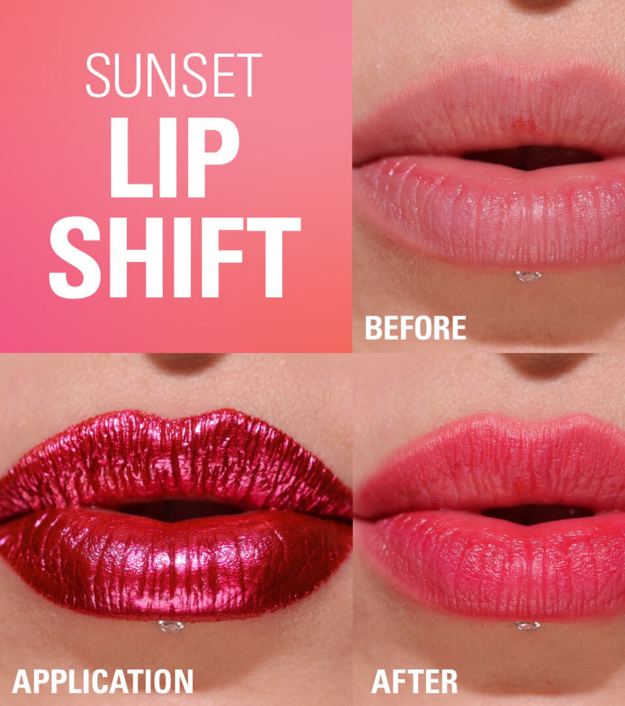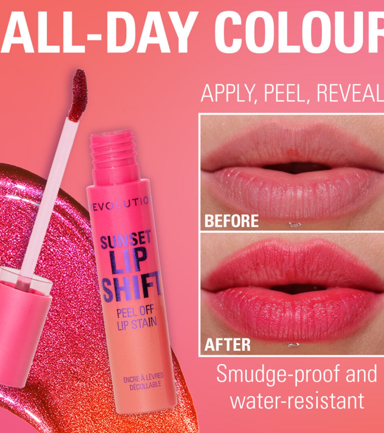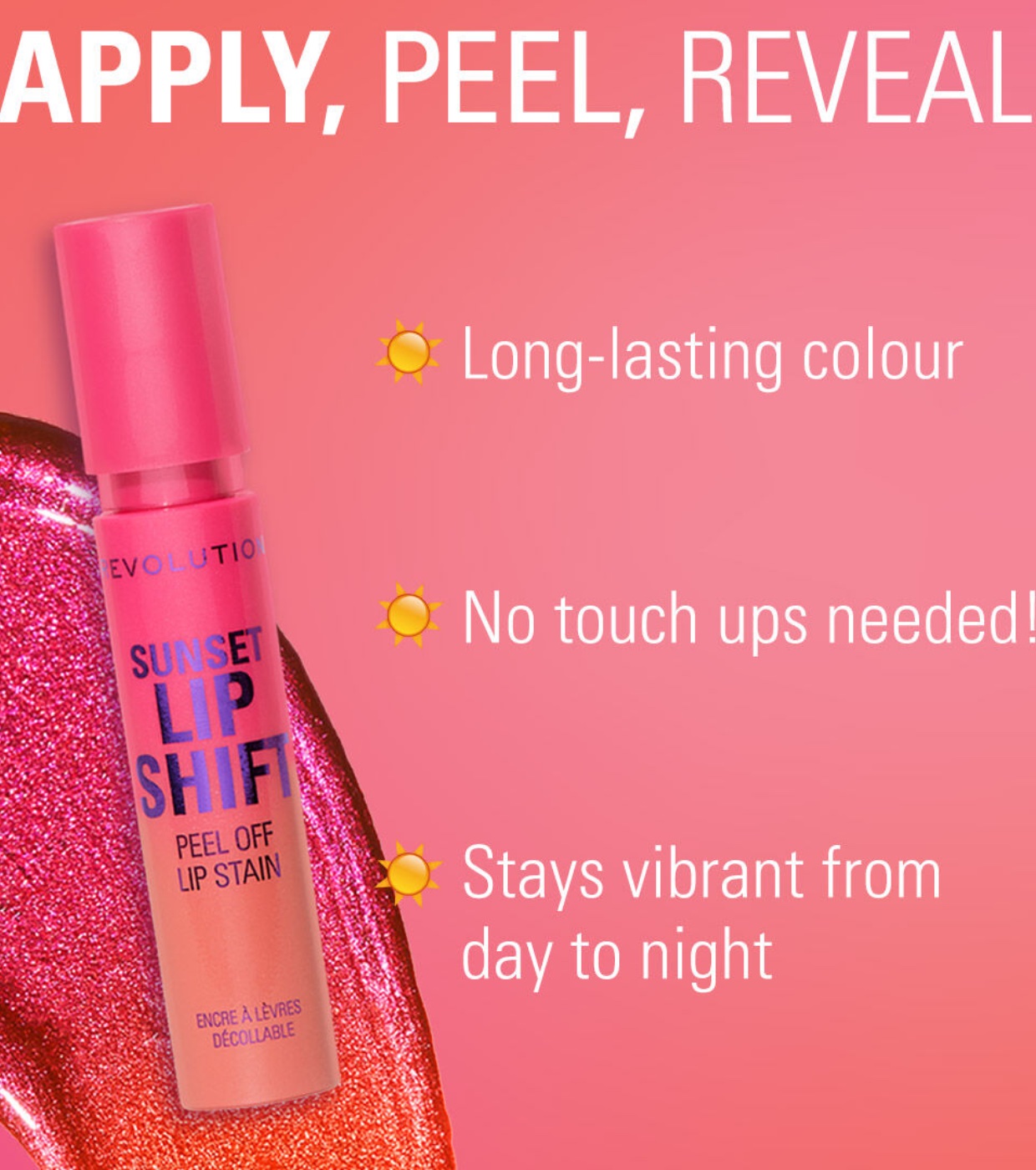 Um gloss rosa hidratante inovador que seca para revelar um batom rosa coral vibrante e duradouro — um look labial para o dia todo, sem retoques, com o batom Revolution Revolution Lip Stain !