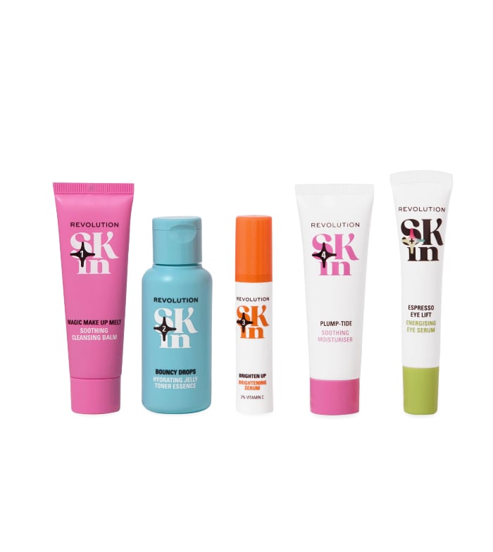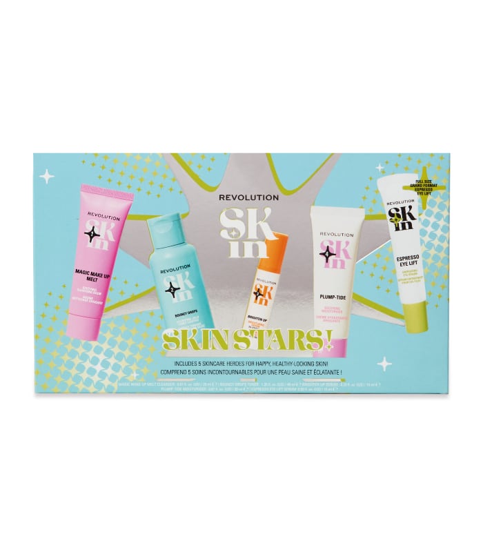 Conheça o kit Revolution Skin Skin Stars: sua rotina de 5 passos para um brilho completo, repleta de mini ícones (e um favorito em tamanho real!).