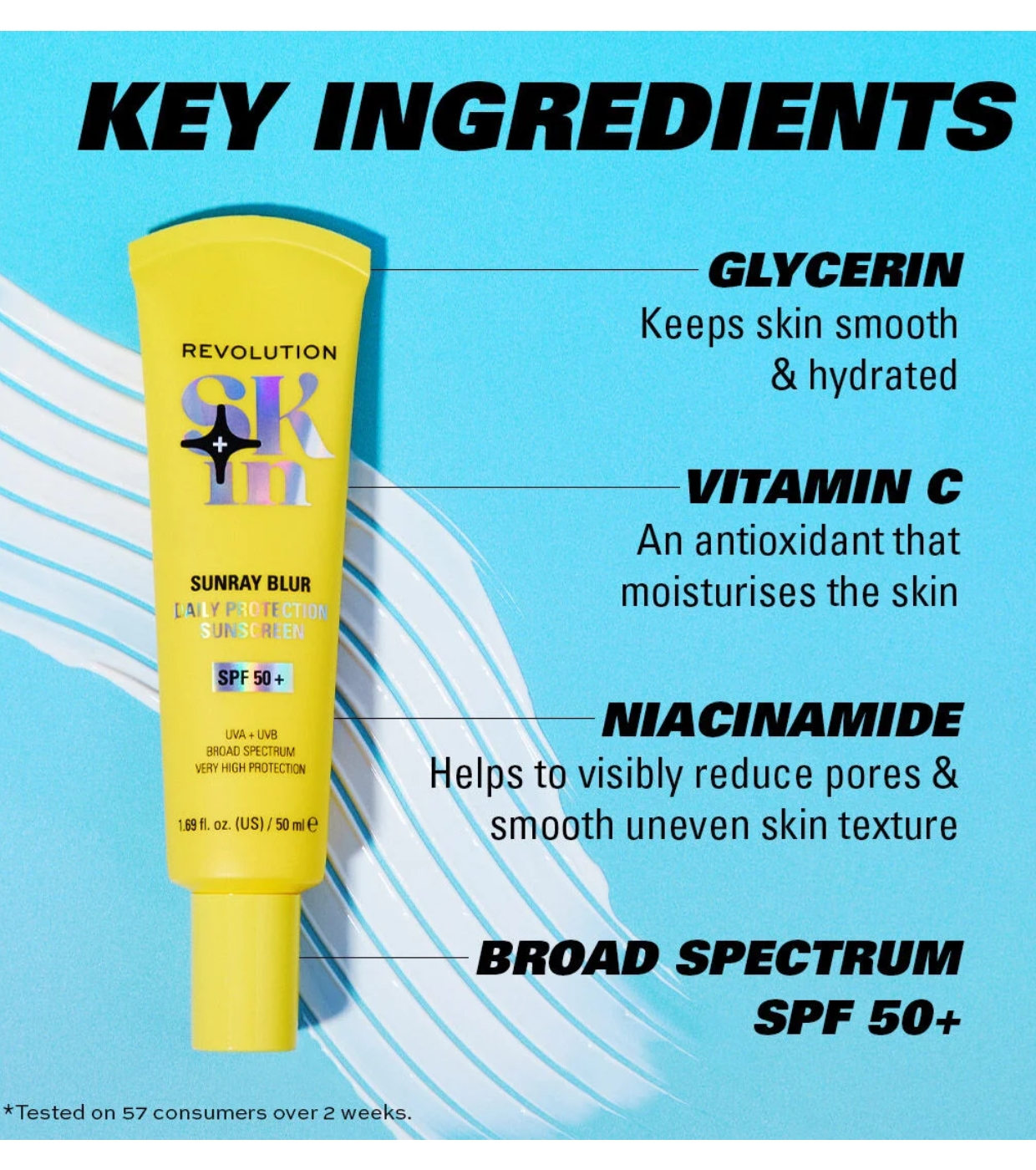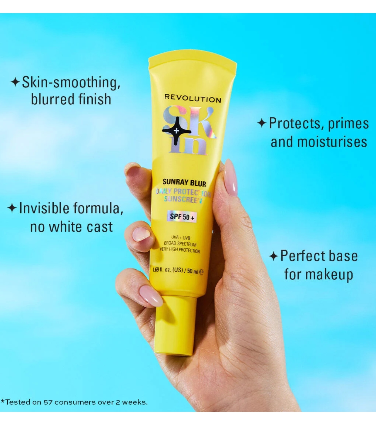 Exiba uma pele macia, hidratada e protegida com o protetor solar matificante Sunray Blur SPF50+ da Revolution !