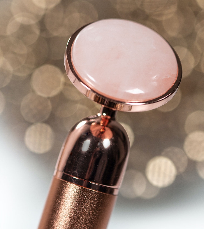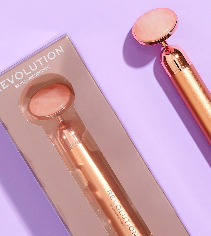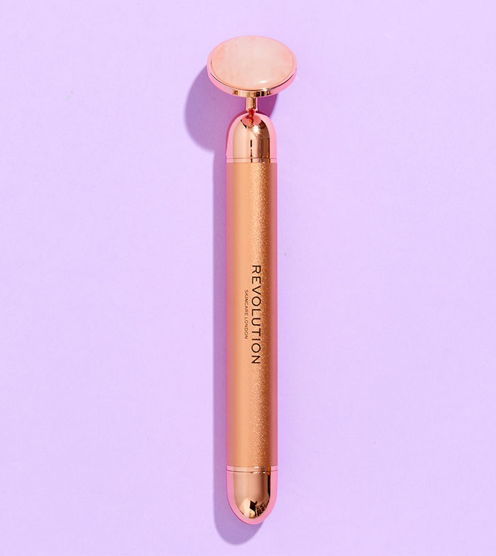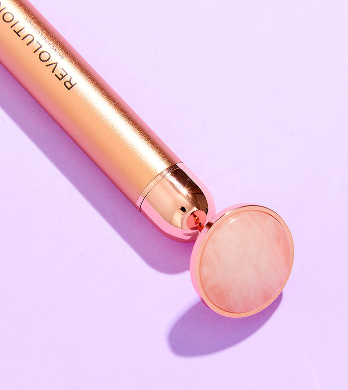 Rolo facial vibratório de quartzo rosa da Revolution Skincare.