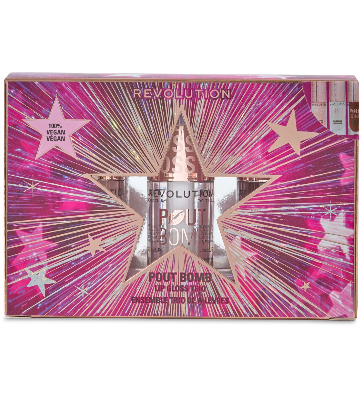 Prepare-se para lábios radiantes com o conjunto de presente Revolution Pout Bomb Plumping Lip Gloss Trio .