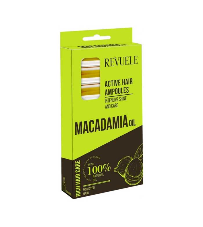Ampolas capilares brilho e cuidado intenso Macadamia Oil da Revuele para um cuidado adaptado aos cabelos coloridos.