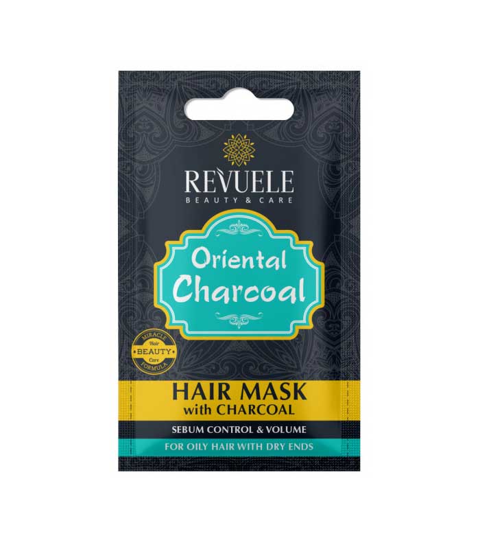 Máscara capilar Revuele carvão Oriental especialmente indicada para cabelos oleosos com pontas secas.