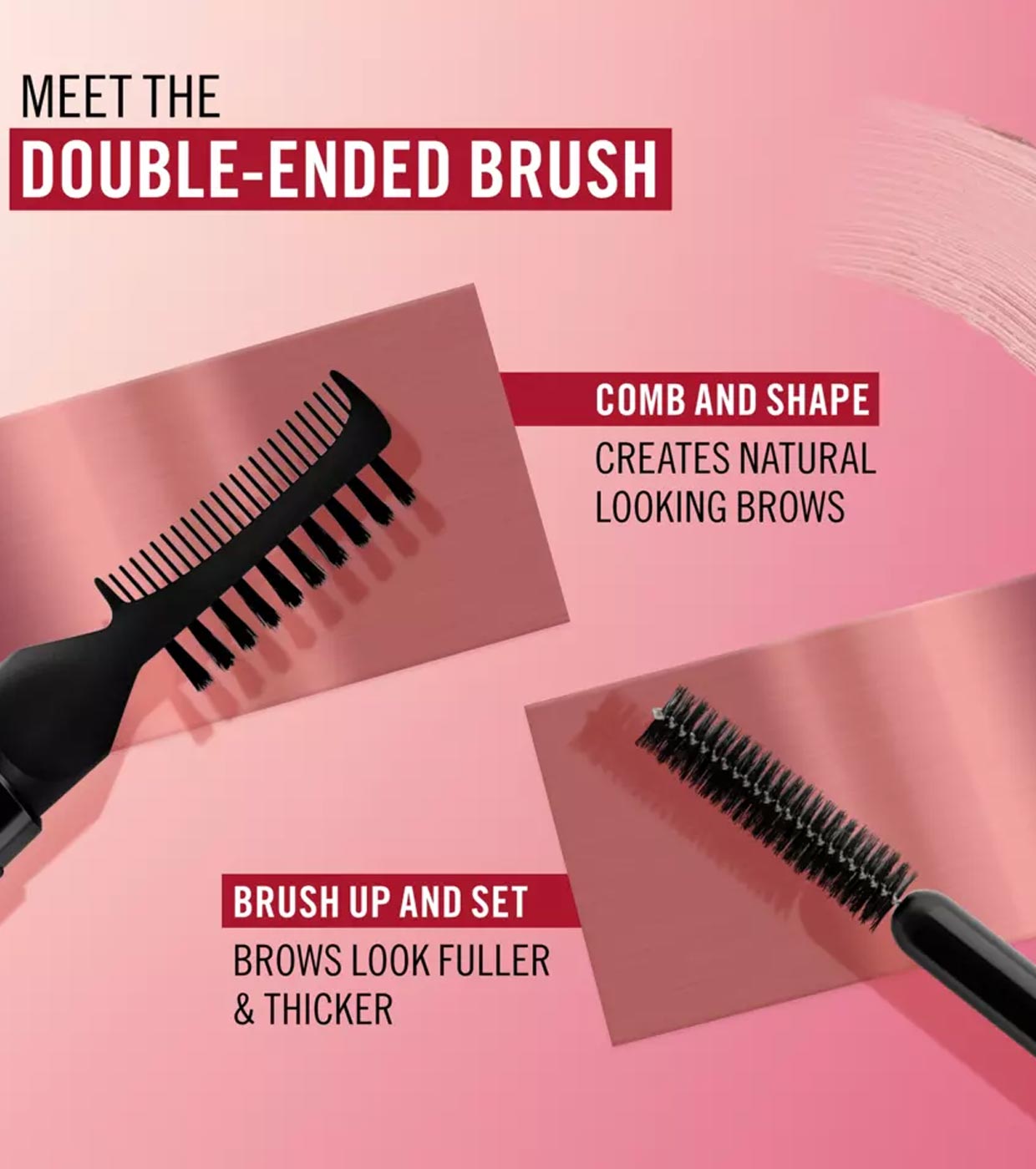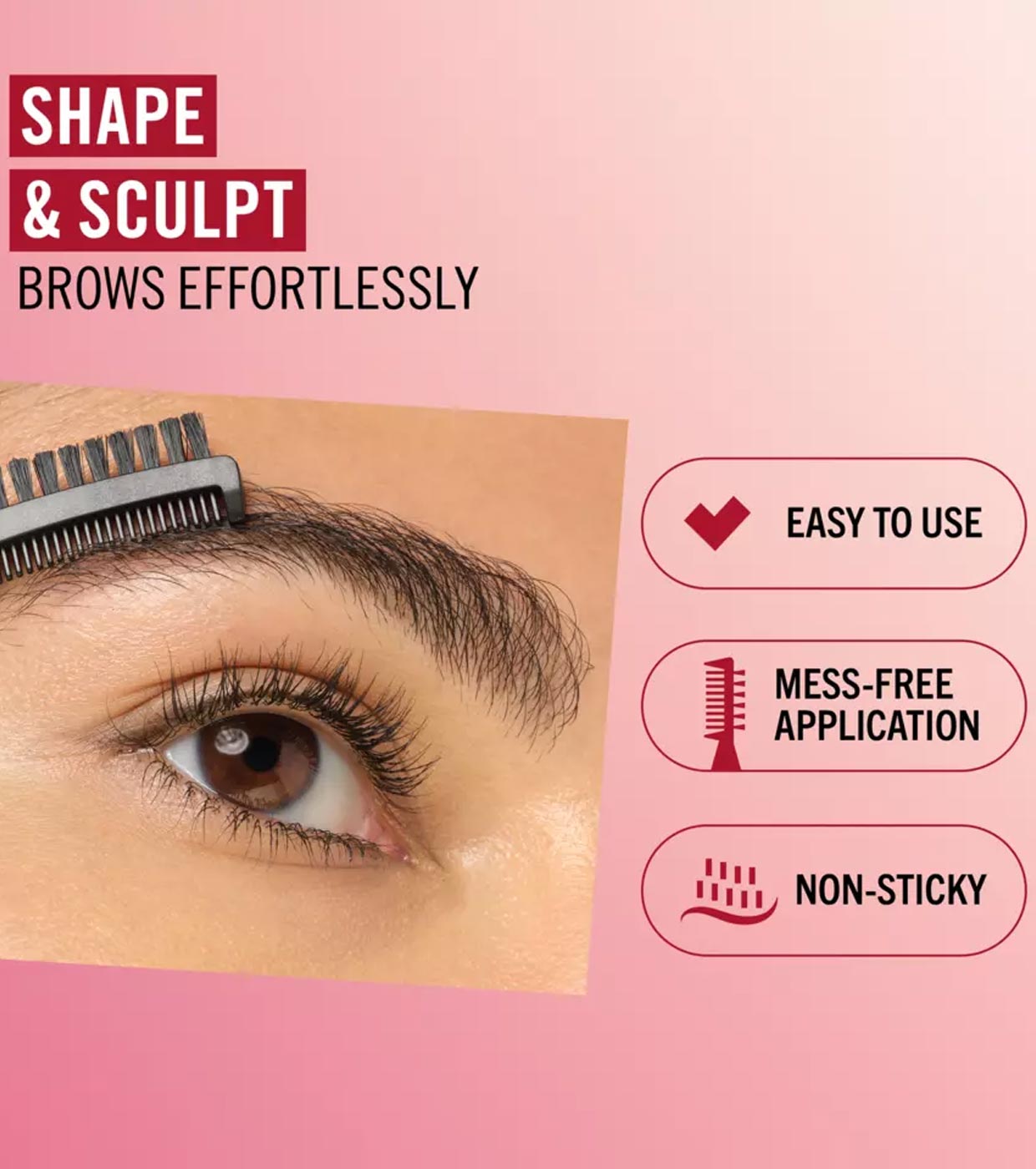 O pente modelador e o pincel esculpem as sobrancelhas de maneira uniforme e garantem uma aplicação não pegajosa e sem sujeira.