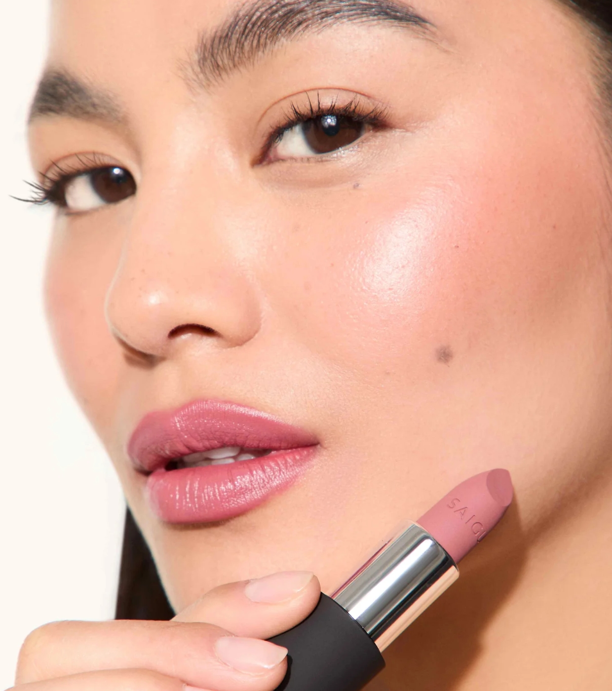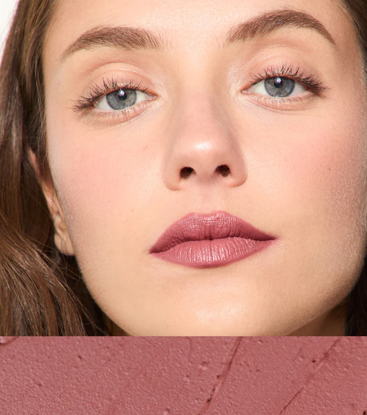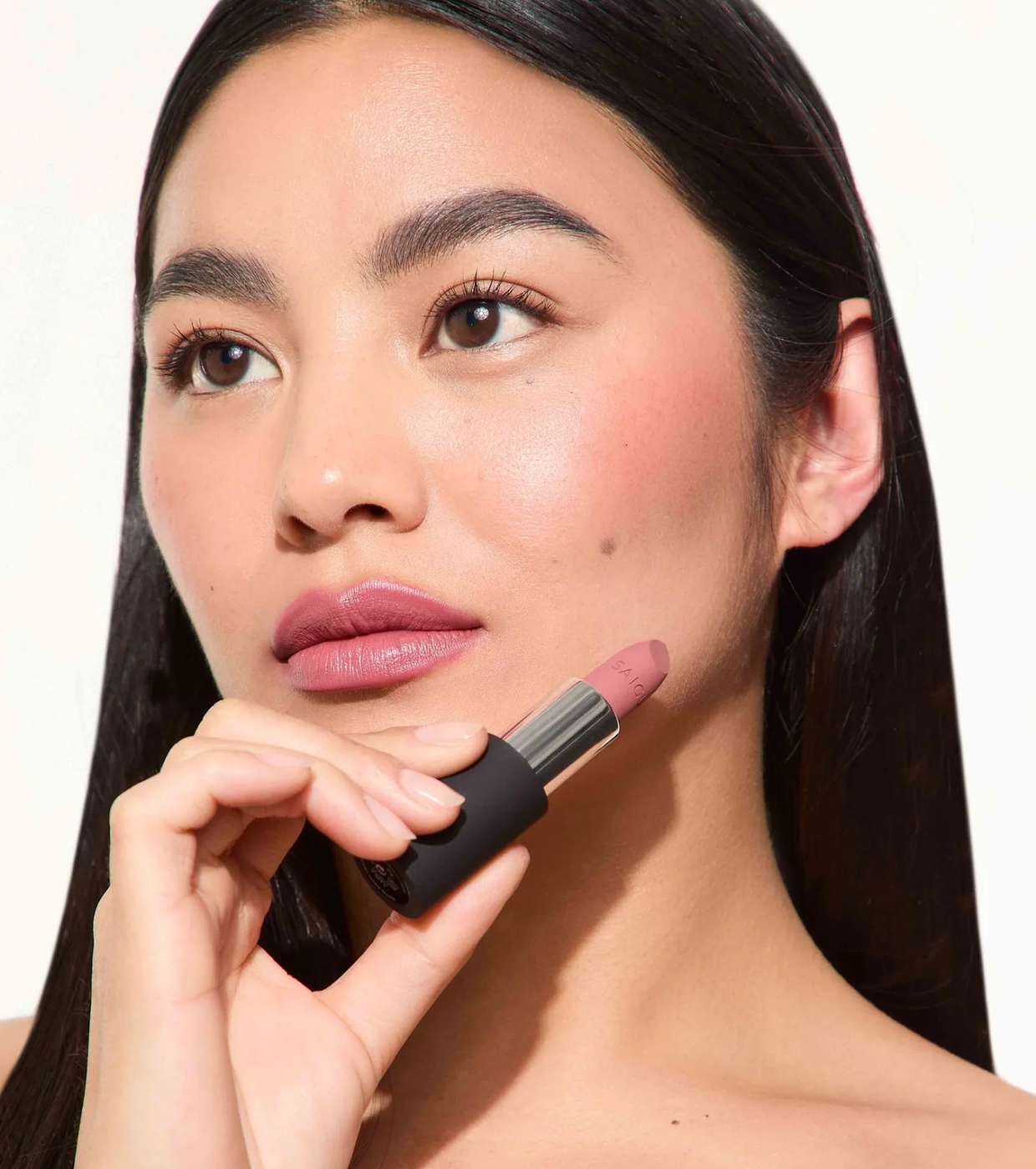 Uma textura sedosa e cremosa que deixa um acabamento semi-matte nos lábios e um acabamento aveludado. Ele cria uma camada muito fina e leve, de modo que não pesa e nem dá para perceber que você está usando.