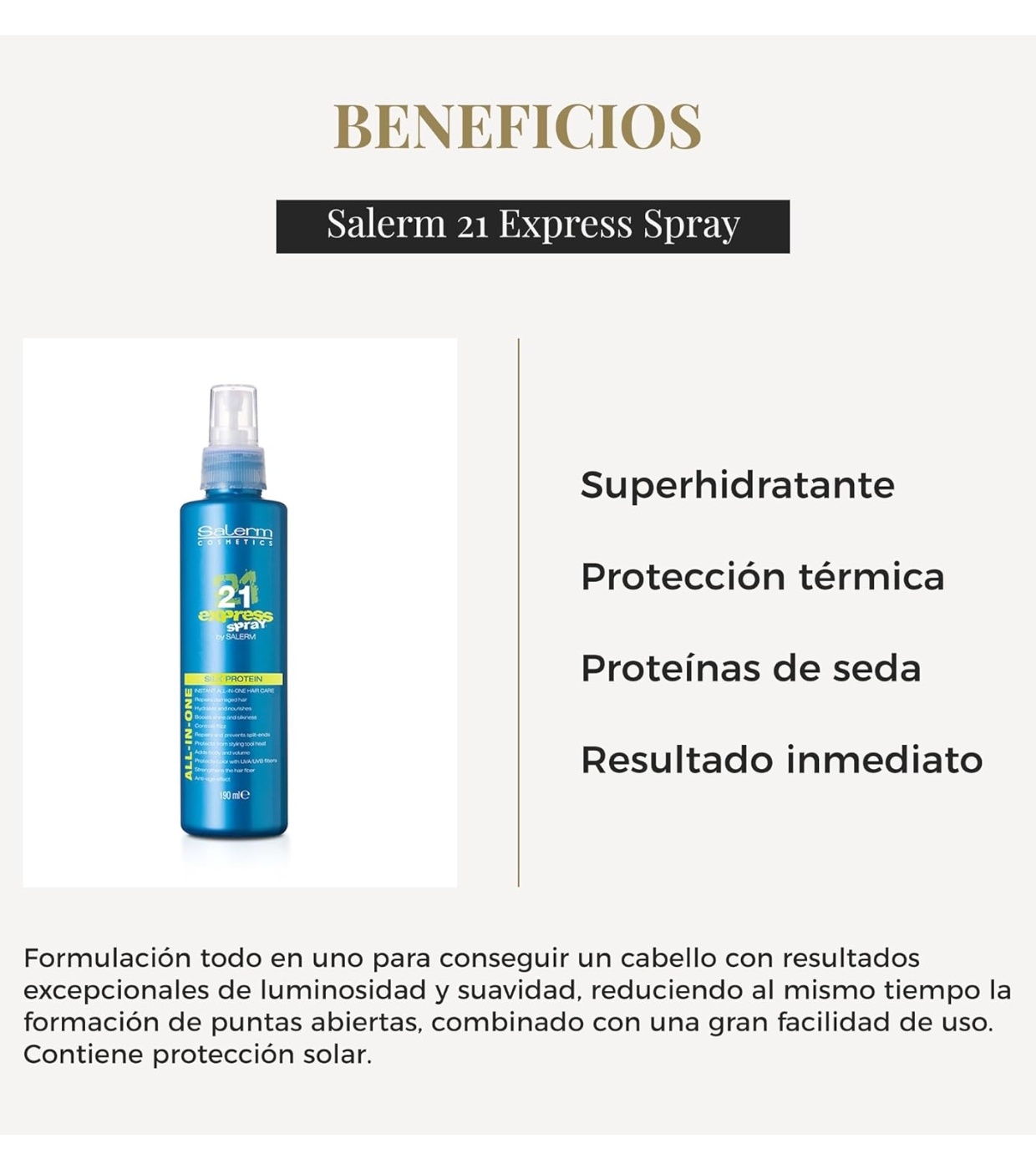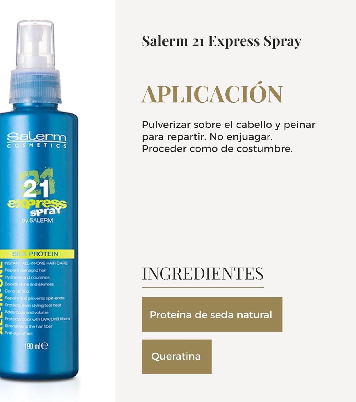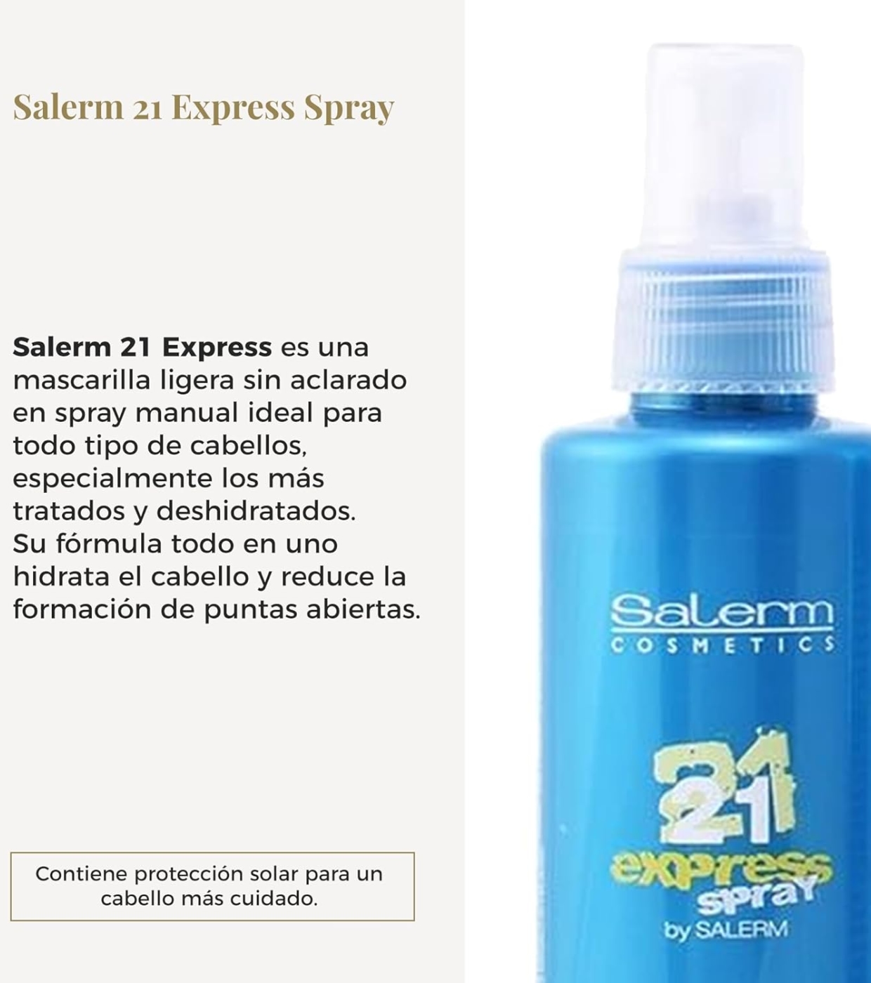 Desfrute de cabelos macios, brilhantes e protegidos em segundos com Salerm 21 Express da Salerm , a máscara leave-in em formato spray que proporciona hidratação intensa e resultados imediatos.