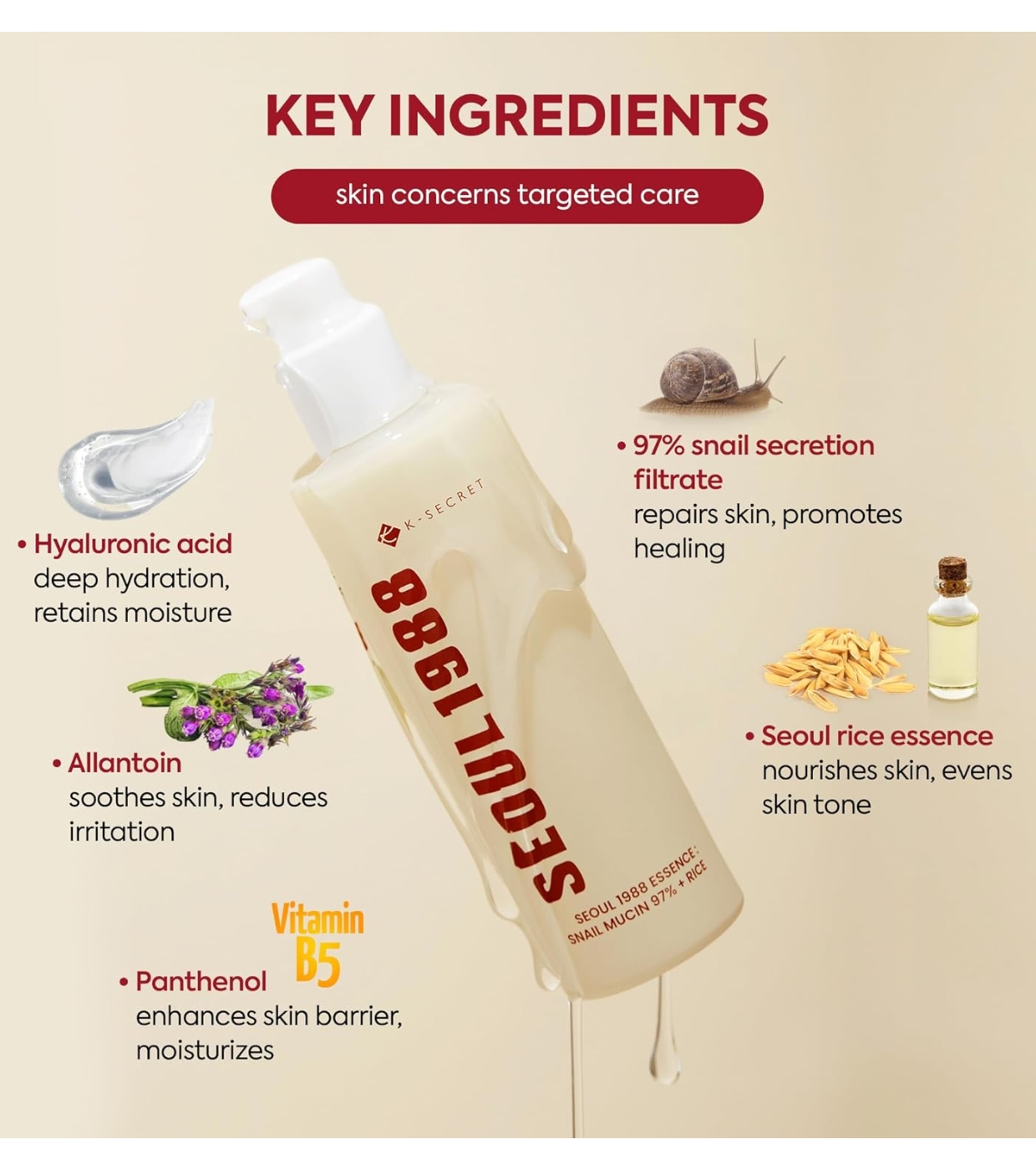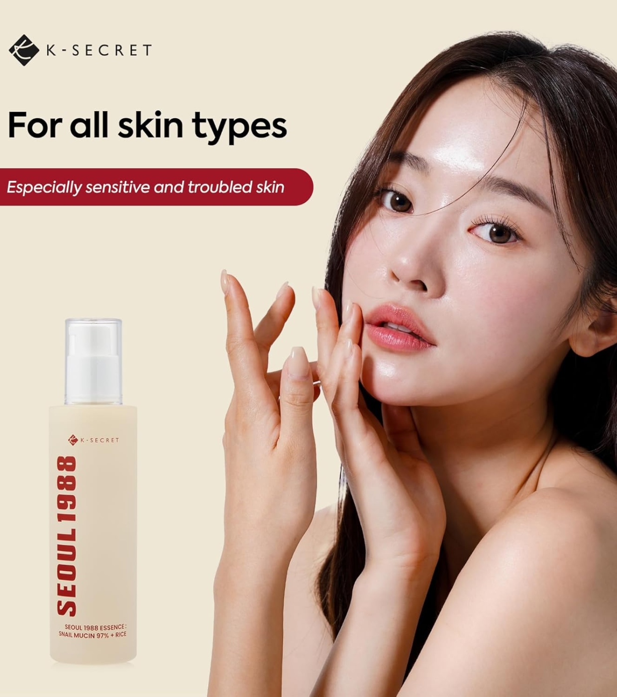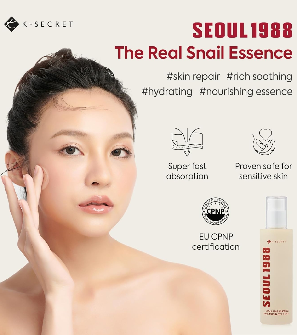 Transforme sua pele com a essência K-secret K-secret , um tratamento intensivo formulado com 97% de mucina de caracol, reconhecida por suas propriedades hidratantes, regeneradoras e cicatrizantes.