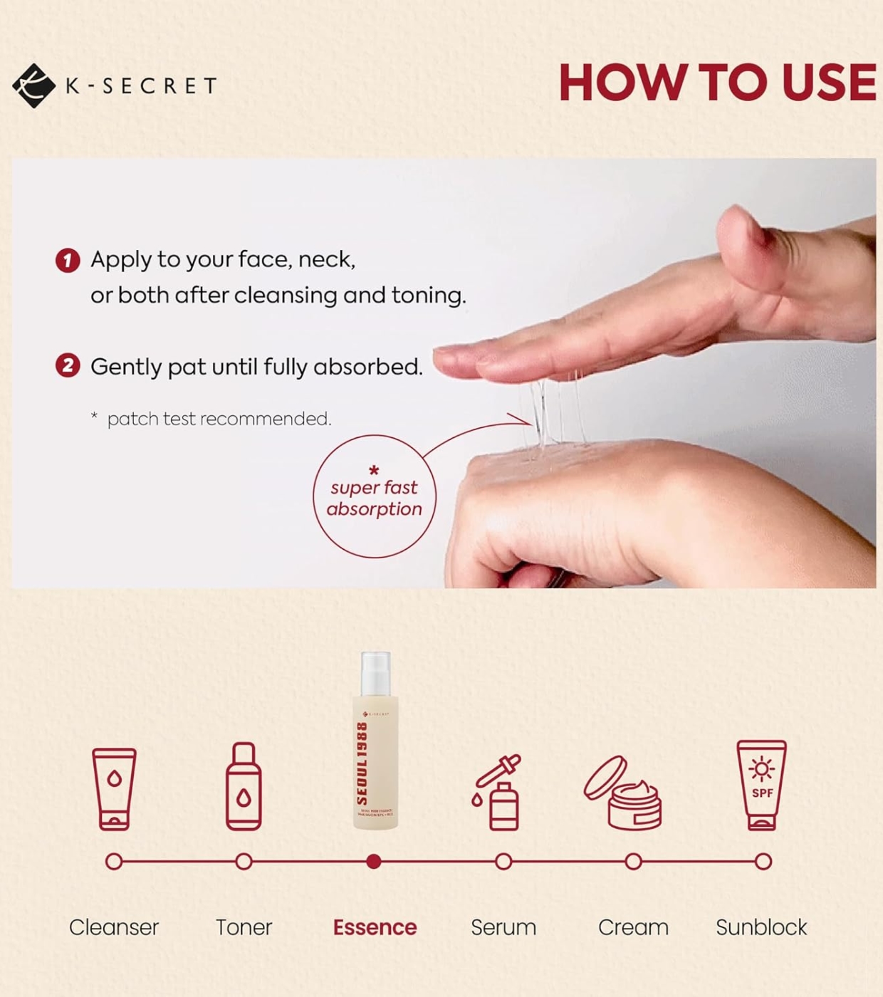 Após a limpeza e tonificação, aplique uma quantidade moderada de essência em todo o rosto e pescoço.