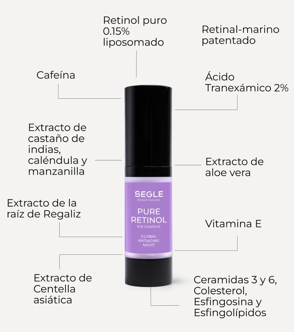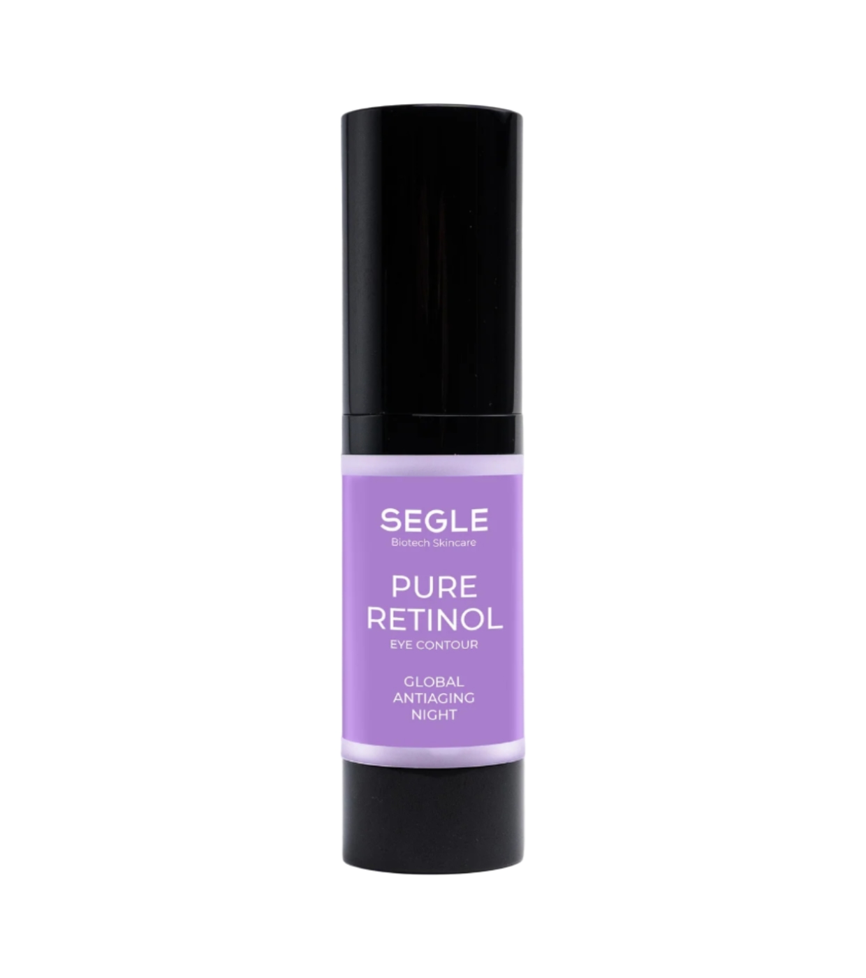 SEGLE Pure Retinol Eye Contour é um tratamento noturno altamente eficaz formulado com 0,15% de retinol puro + retinal marinho, projetado para combater todos os sinais de envelhecimento nas áreas mais delicadas do rosto.